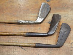 three wooden shaft golf clubs