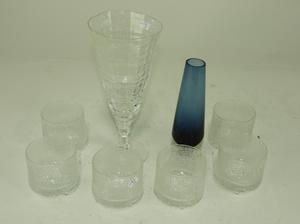 rosenthal vase, six ultima thule "on the rocks" whiskey glasses designed by tapio wirkkala c.1968 and an orrefors blue glass vase ht. 6 1/2"