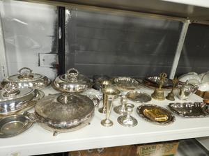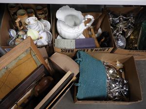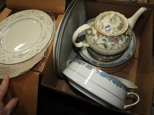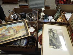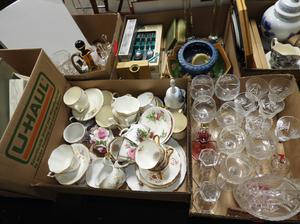 Jewelry including gold and gemstone, silver and costume. Sterling silve and silver plate serving items. Many porcelain dinnerware sets including Aynsley, Royal Crown Derby and Minton. English china figurines and European animal groups. Many, many, many lots of tea cups! Chinese and Japanese items, lighting and other antiques and collectables.