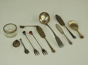Costume jewelry, silver and gold jewelry, sterling silver including a Georgian footed salt seller, good quality silver plate, many porcelain dinnerware sets, flow blue including some rare pieces, Royal Doulton figurines, tea cups and saucers including Aynsley, Paragon and Royal Albert, Royal Crown Derby imari pattern china, Inuit carvings, over 350 lots of Antiques and Collectables.