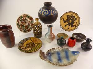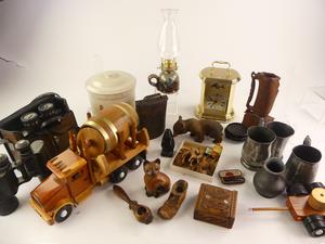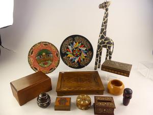 micro-mosiac inlaid box with other carved or lacquered wooden items