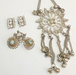 ethnic silver pendant, 2 earrings, 2 collar clips with five assorted bead and crystal necklaces