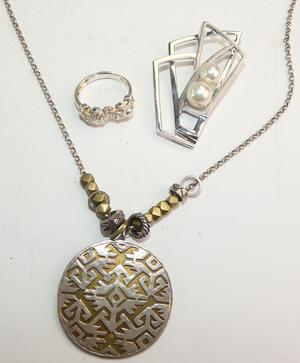 mod sterling silver pearl brooch, pendant necklace and ram ring