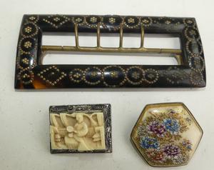 victorian tortoise buckle, satsuma brooch and filigree silver brooch