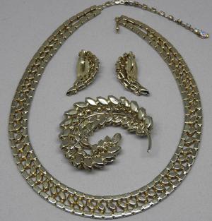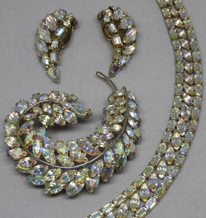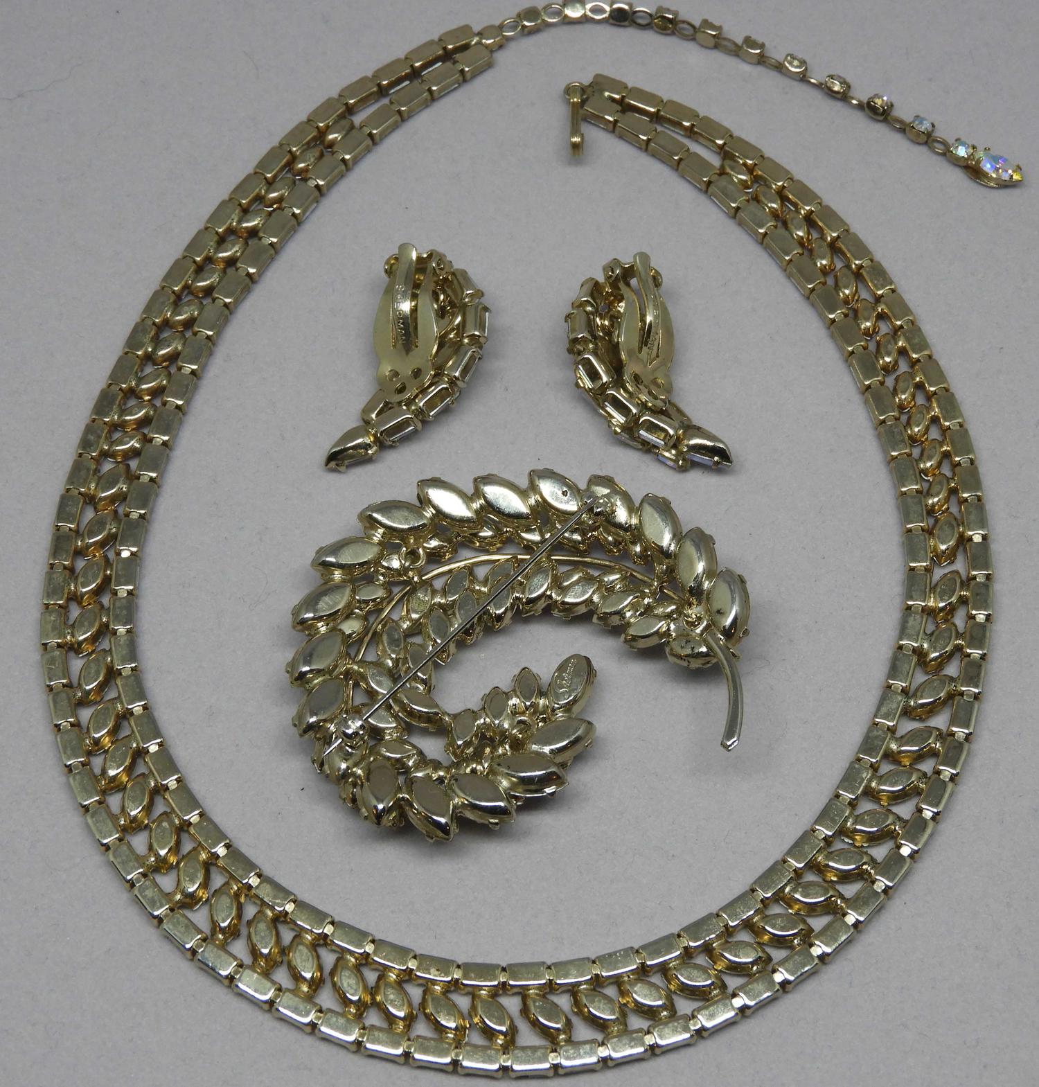 Aurora Borealis necklace, brooch and clip earrings set, signed, necklace - 18".