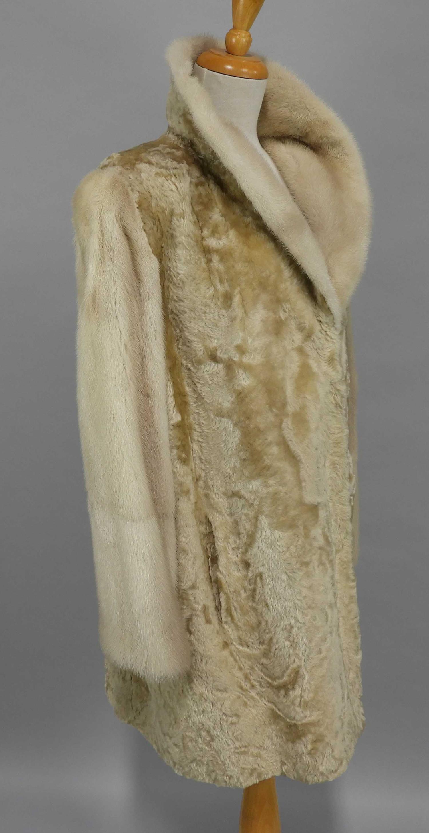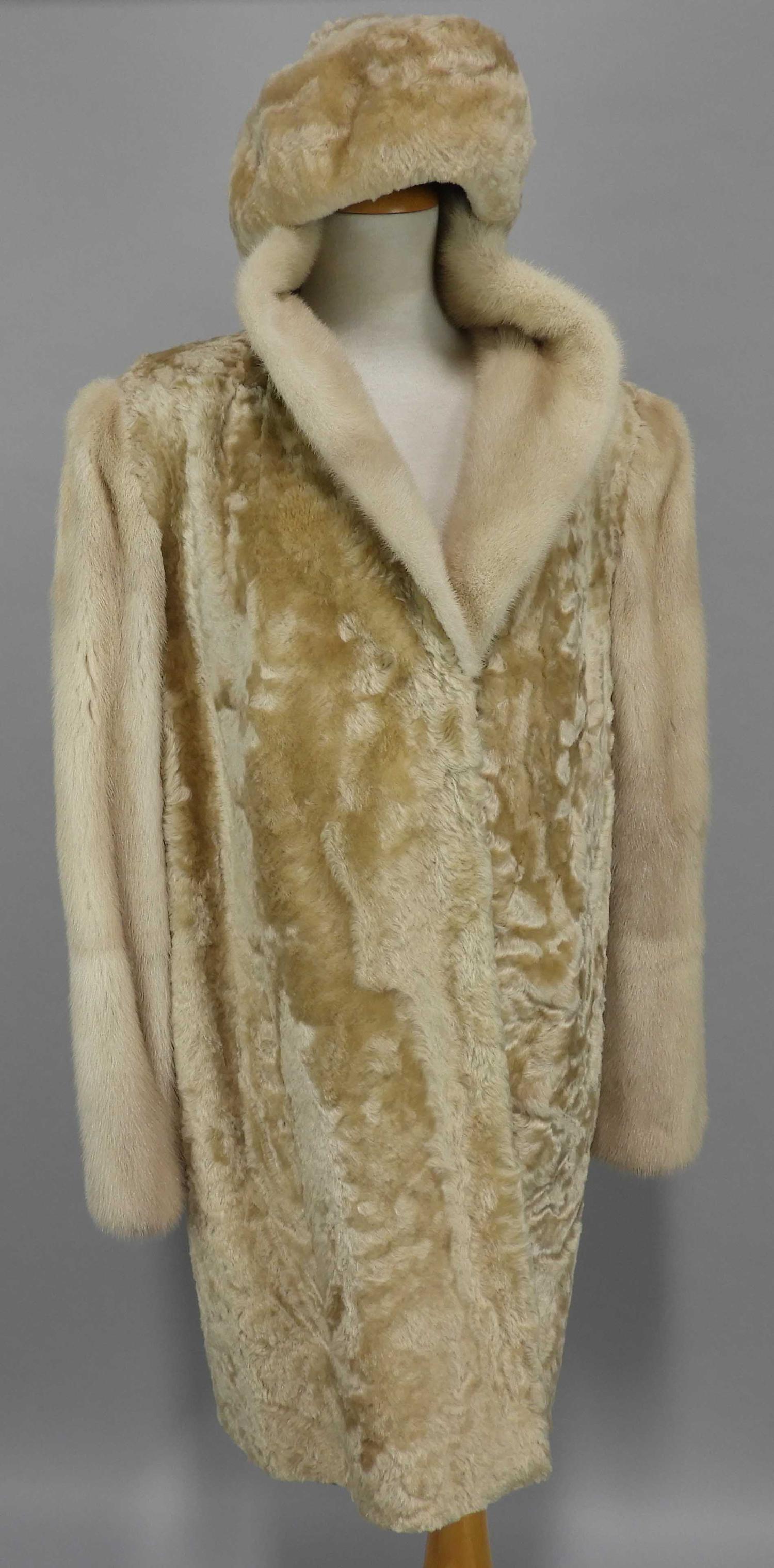 champagne broadtail and mink 3/4 length coat with matching hat.