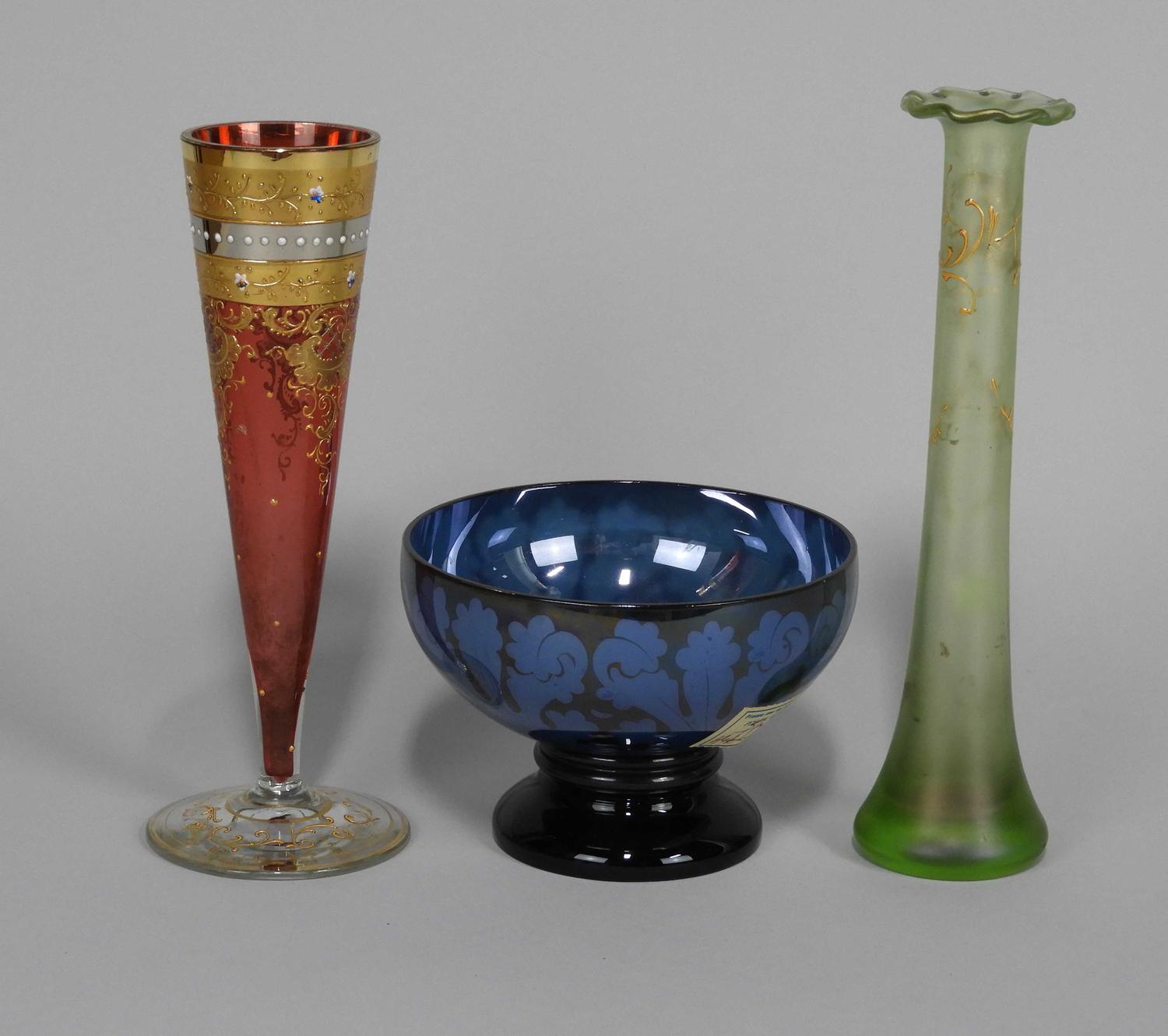 gene beck art glass bowl with two art glass vases.