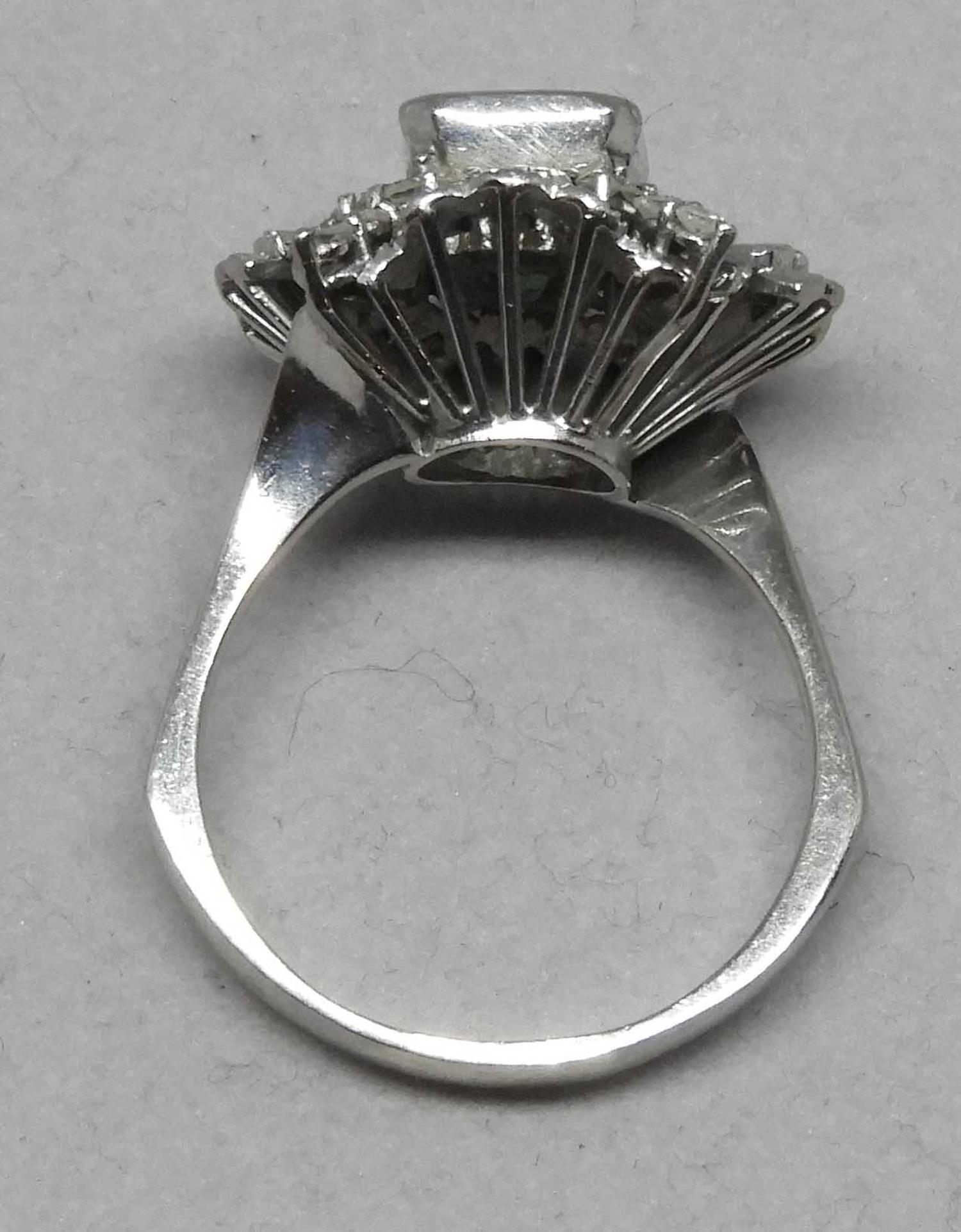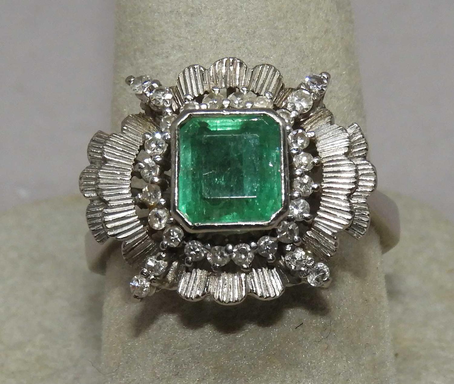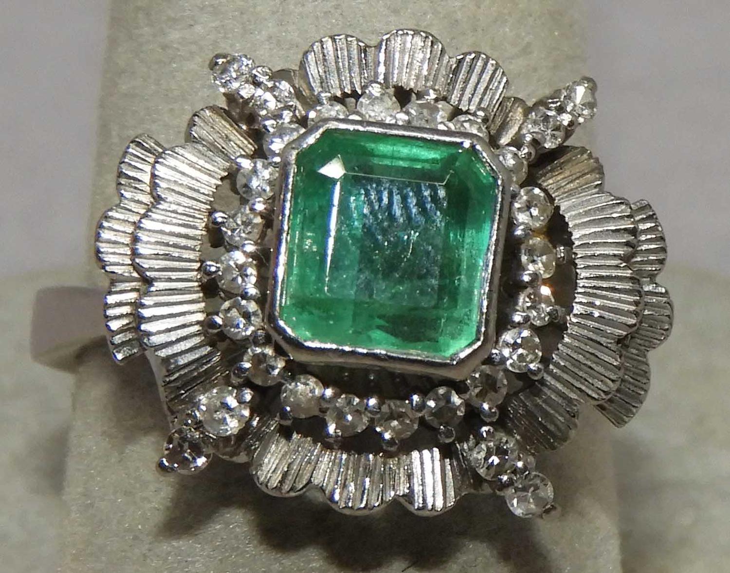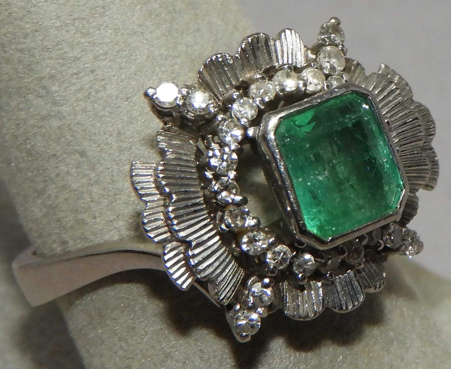 Cushion cut emerald bezel set with single cut diamonds surround, 18K white gold, size 7 1/2