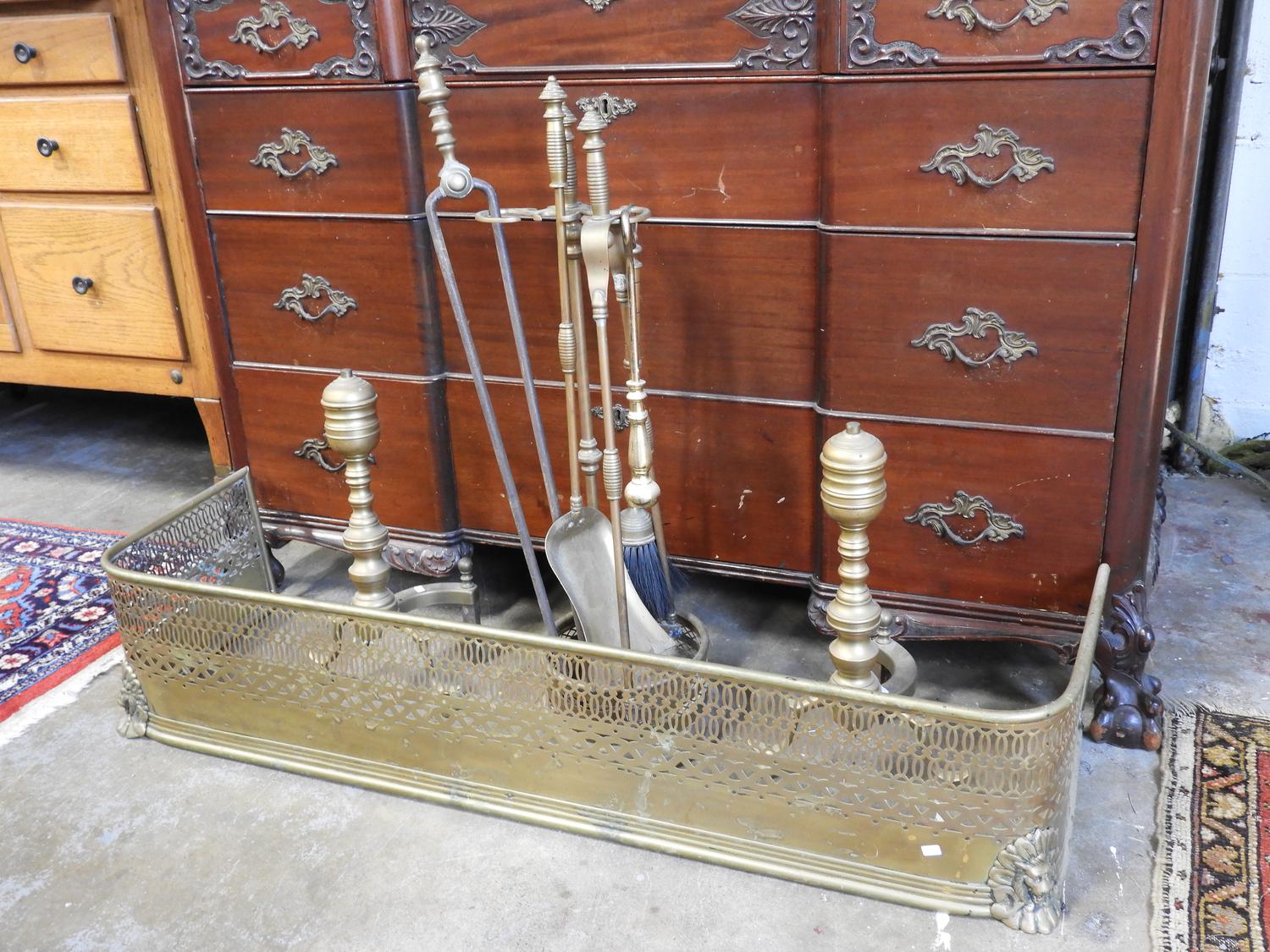 19th century fire fender, tools on stand and pair of andirons.
