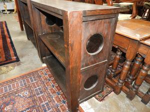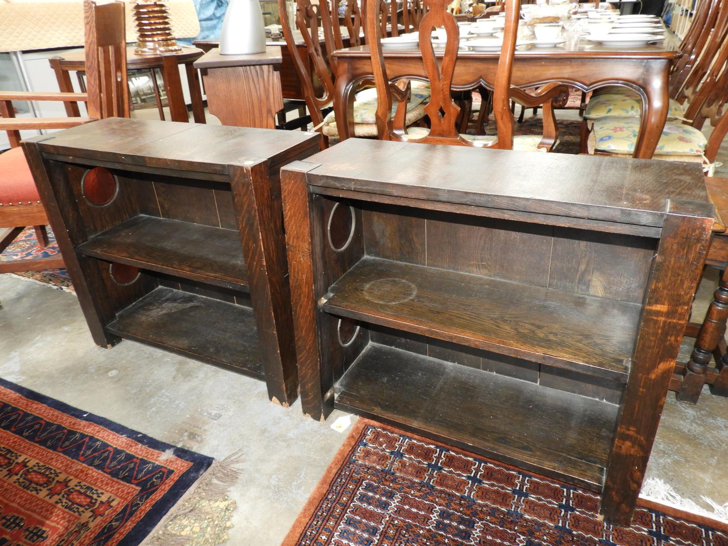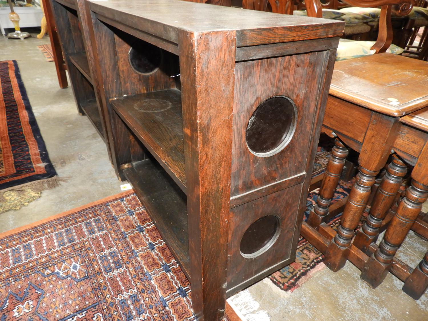 pair of arts & crafts oak bookcases with inset stained glass panels