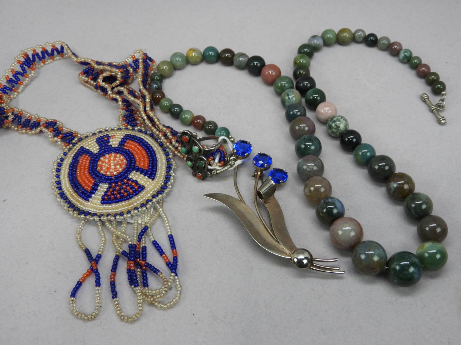 agate bead necklace, sterling 1940s brooch and navajo silver coral turquoise ring