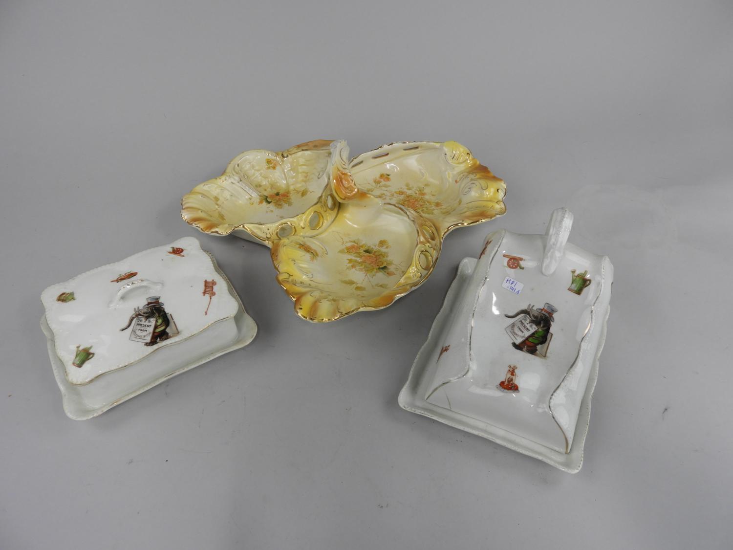 middleport pottery 3 section handled dish, cheese dome and butter dish