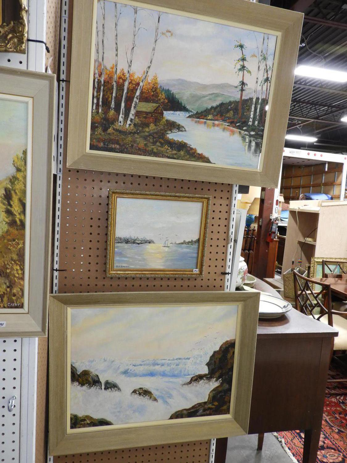 b. j. smith, three oil paintings, "landscapes"with another oil painting.