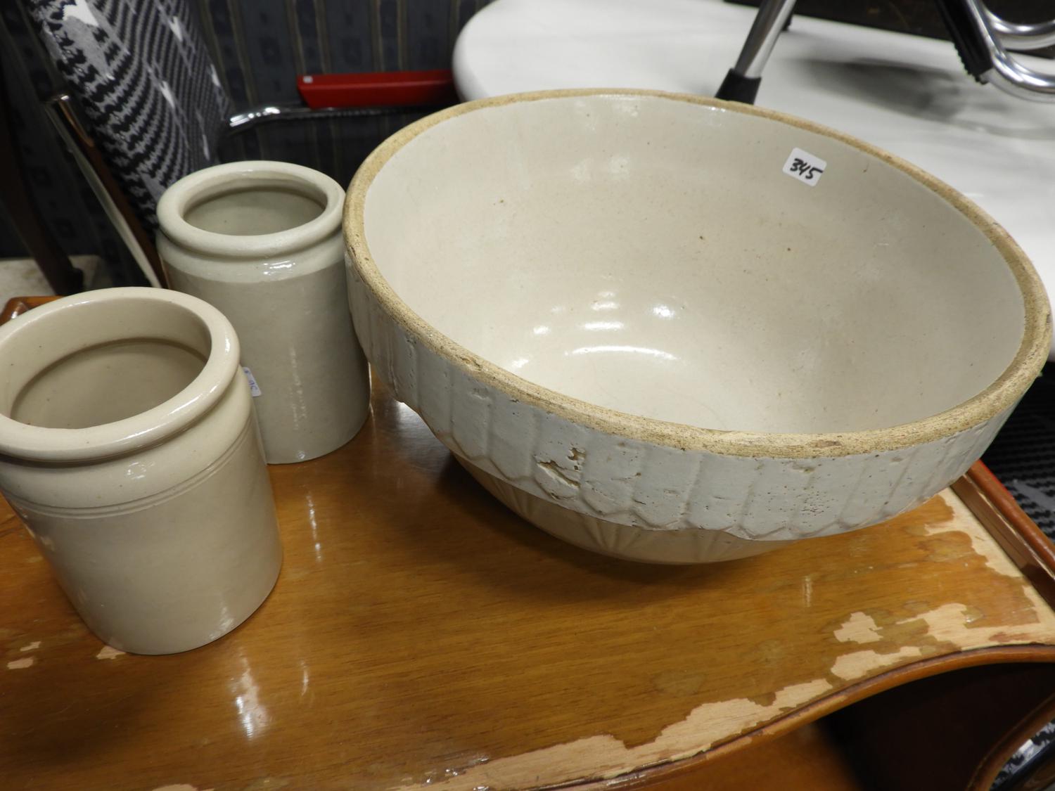 glazed earthenware mixing bowl and two jars.