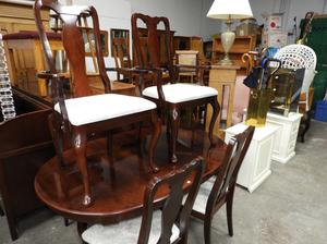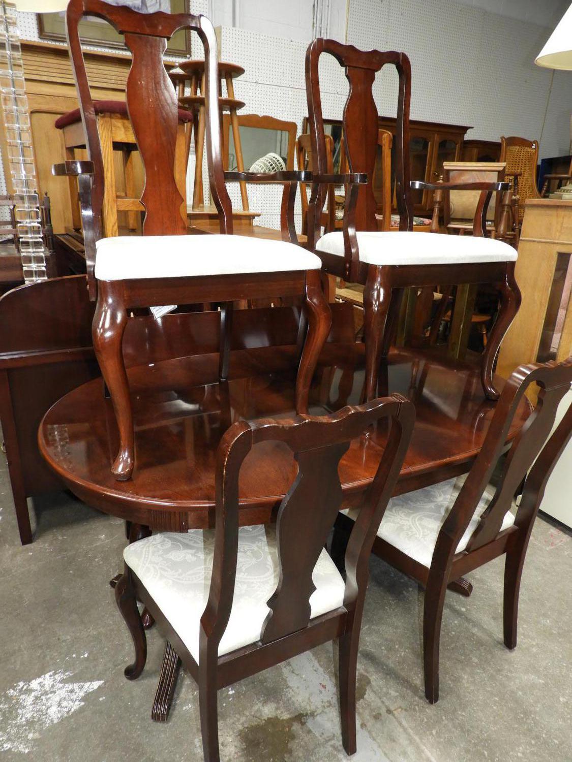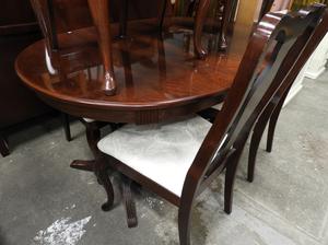 mahogany finish dining table with six chairs.