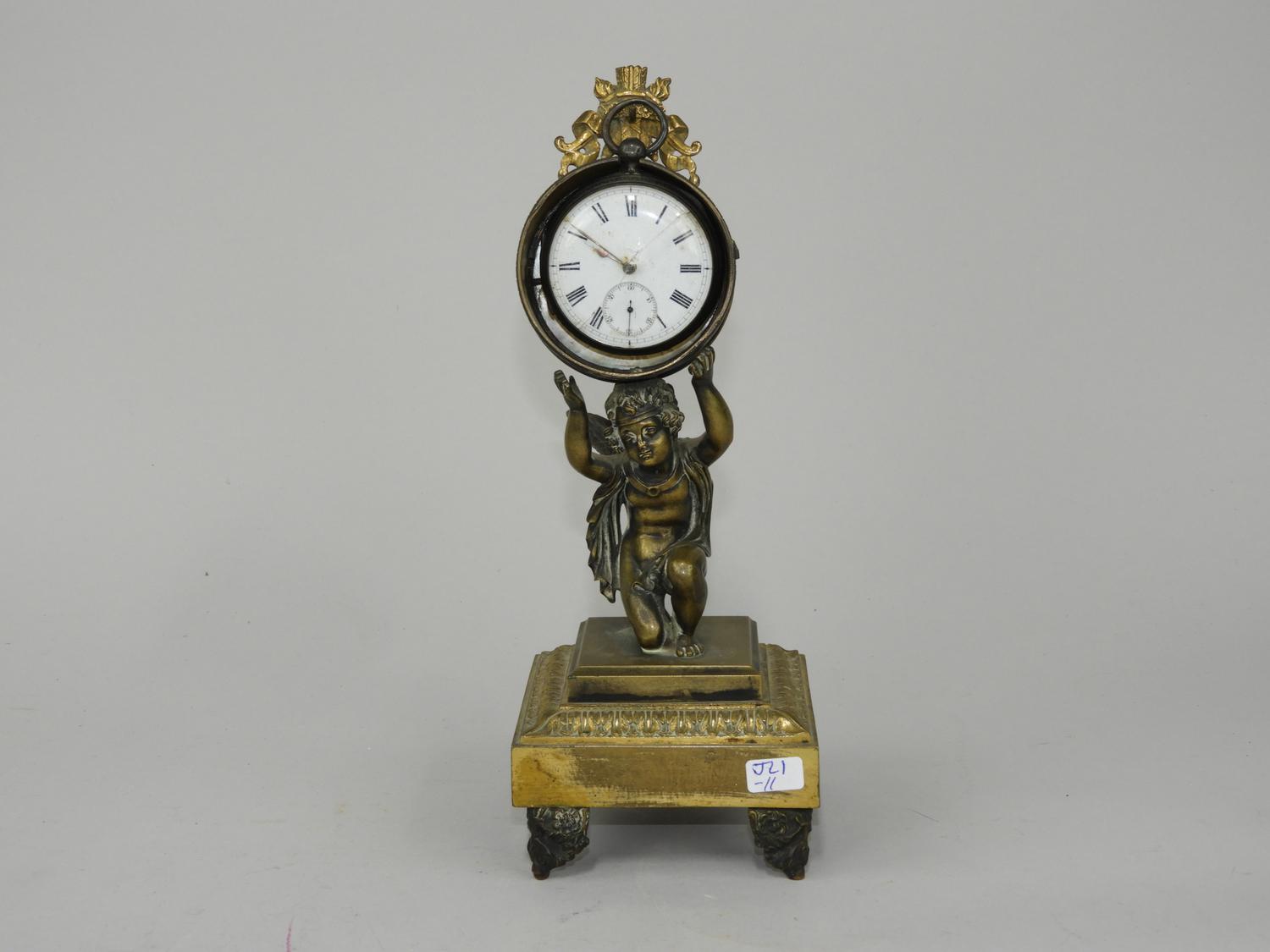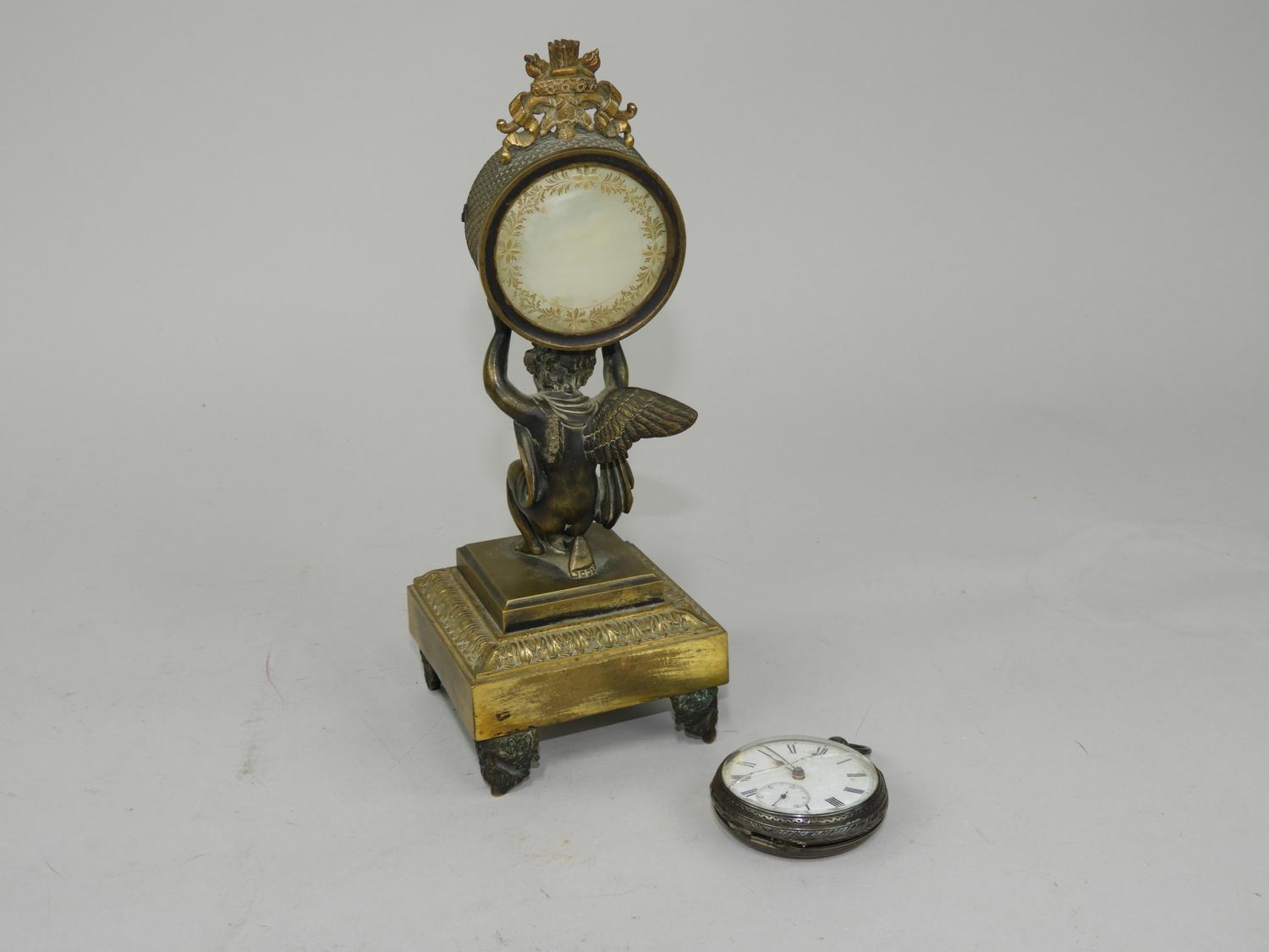 19th century gilt bronze patinated and carved mother of pearl figural pocket watch stand with an hallmarked english sterling pocket watch.