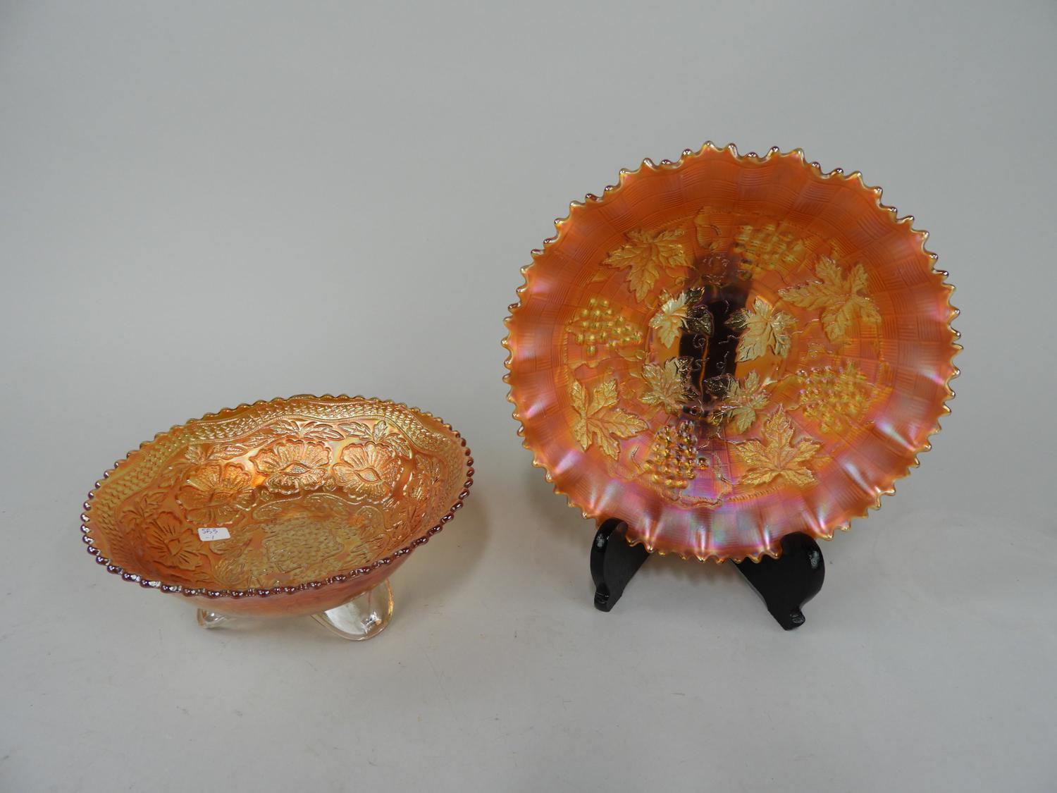 carnival glass footed bowl with a carnival glass pedestal bowl.