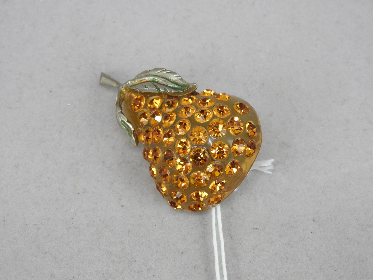 vintage lucite forbidden fruit rhinestone encrusted pear brooch