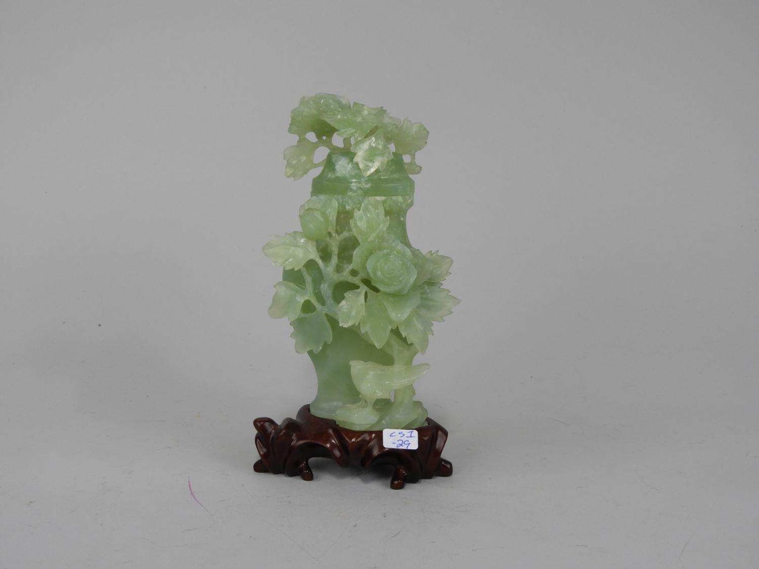 chinese carved jade covered bottle on stand, height 6 3/4"