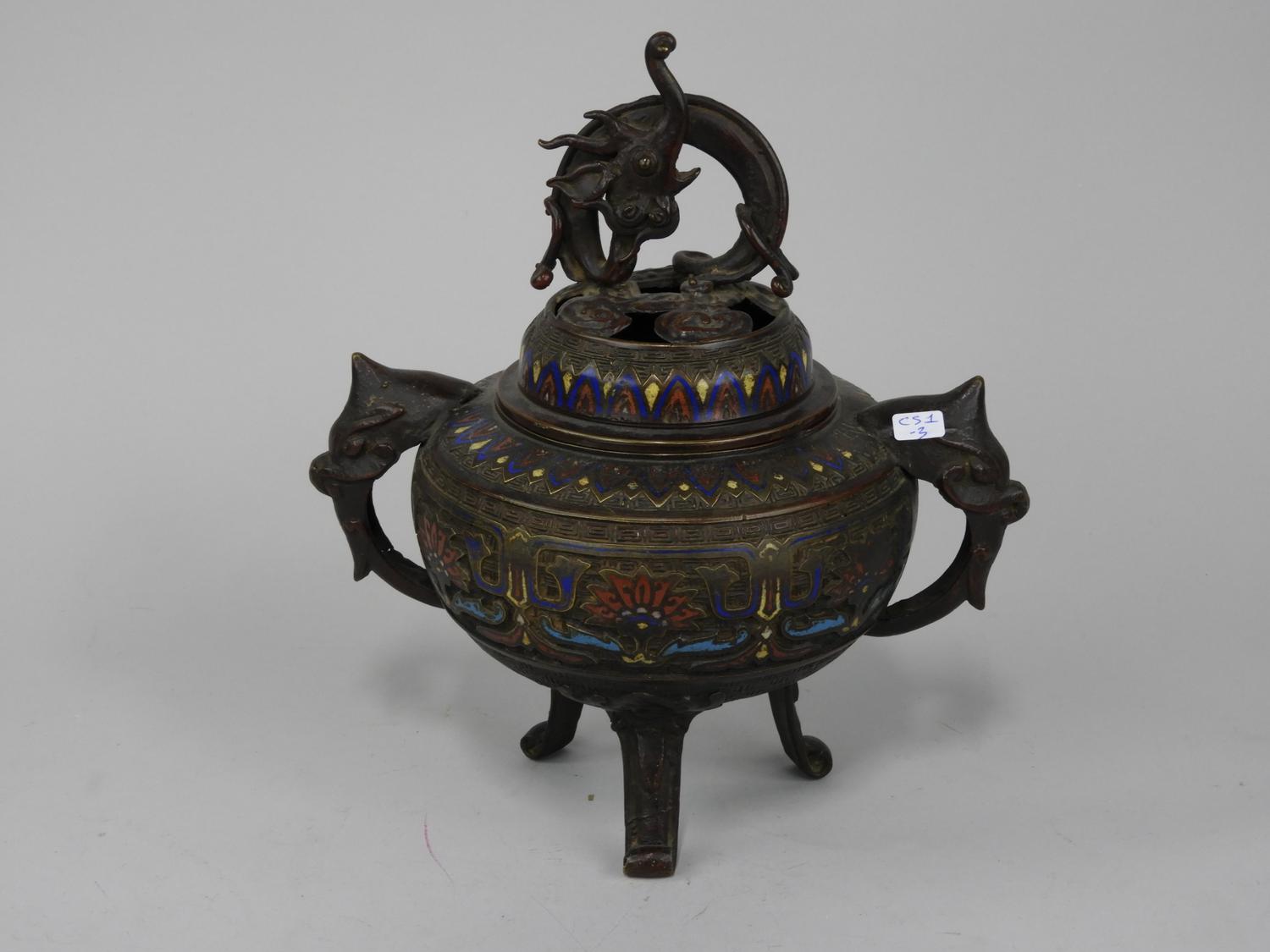 asian enamelled bronze footed incense burner, height 10 1/2"