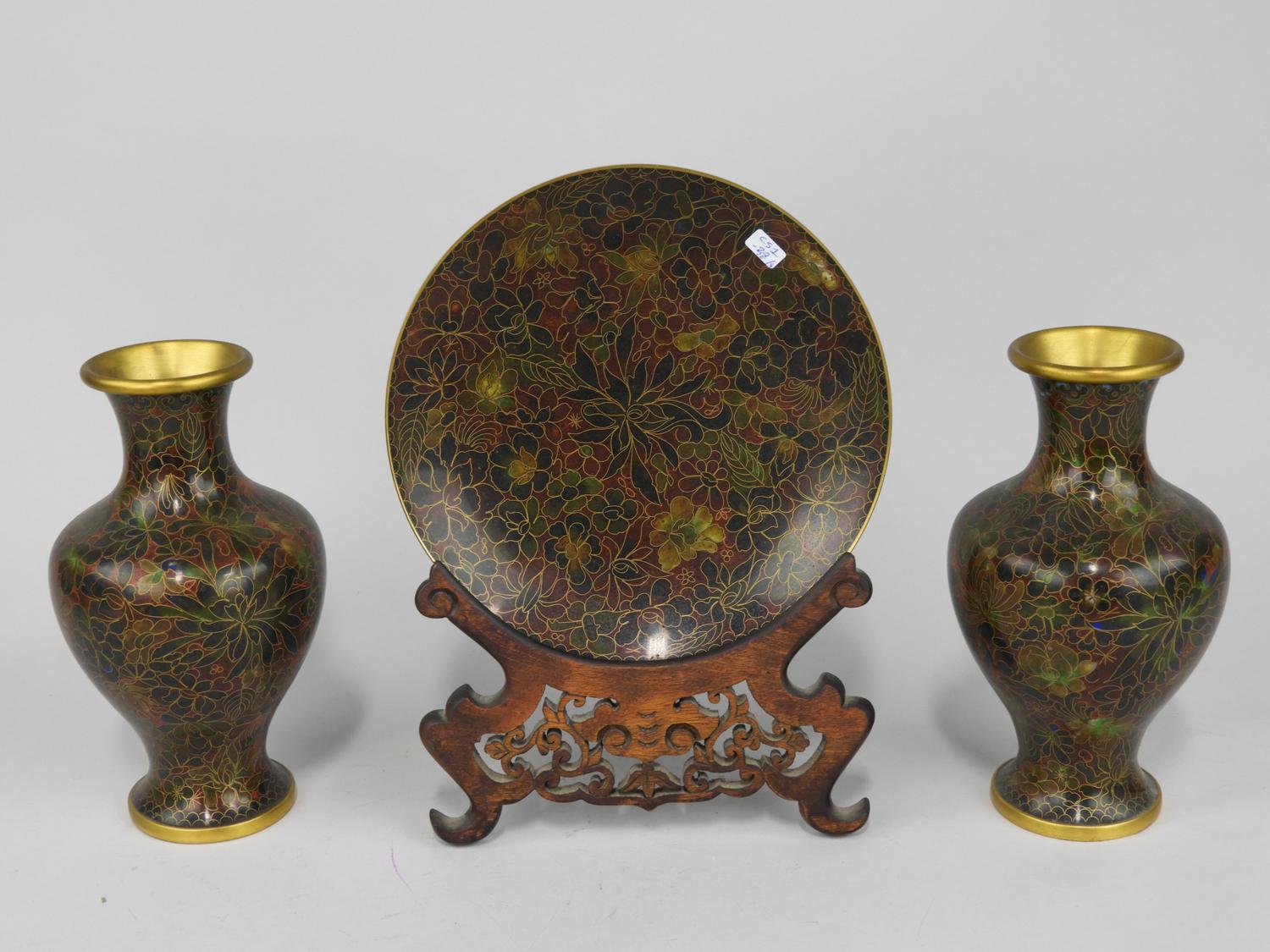chinese cloisonne enamel plate and two vases, ht. 11"