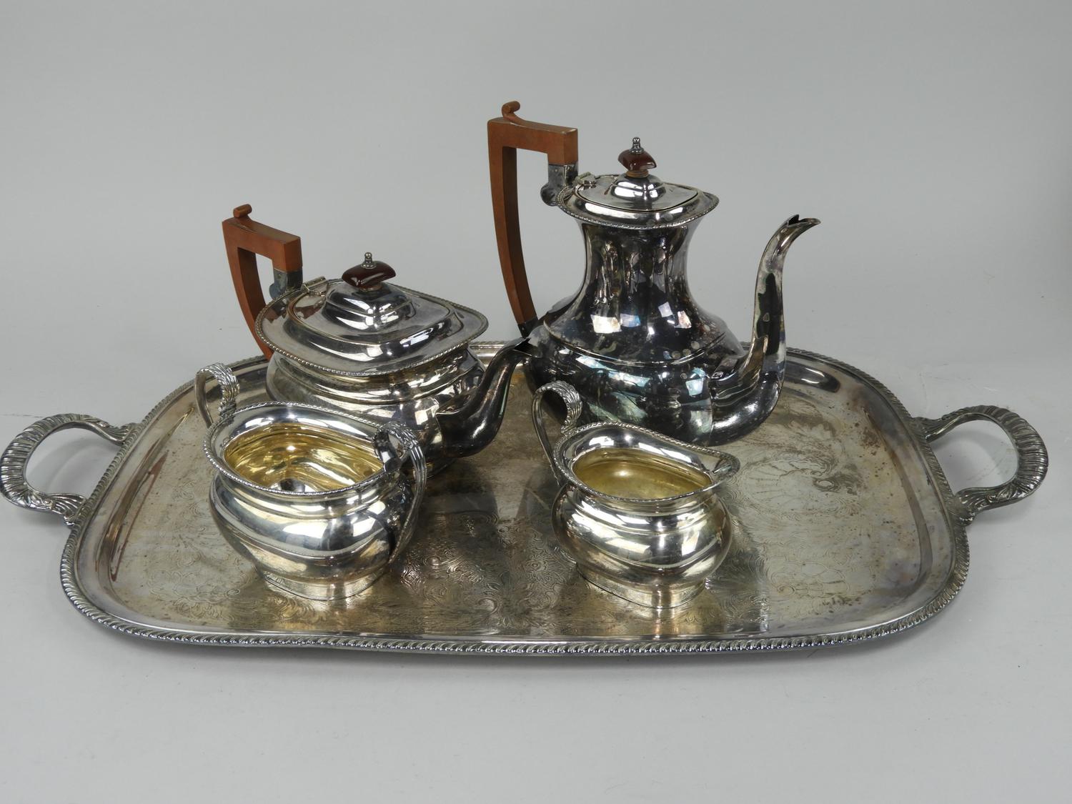 silver plate four piece tea and coffee service with two handled tray