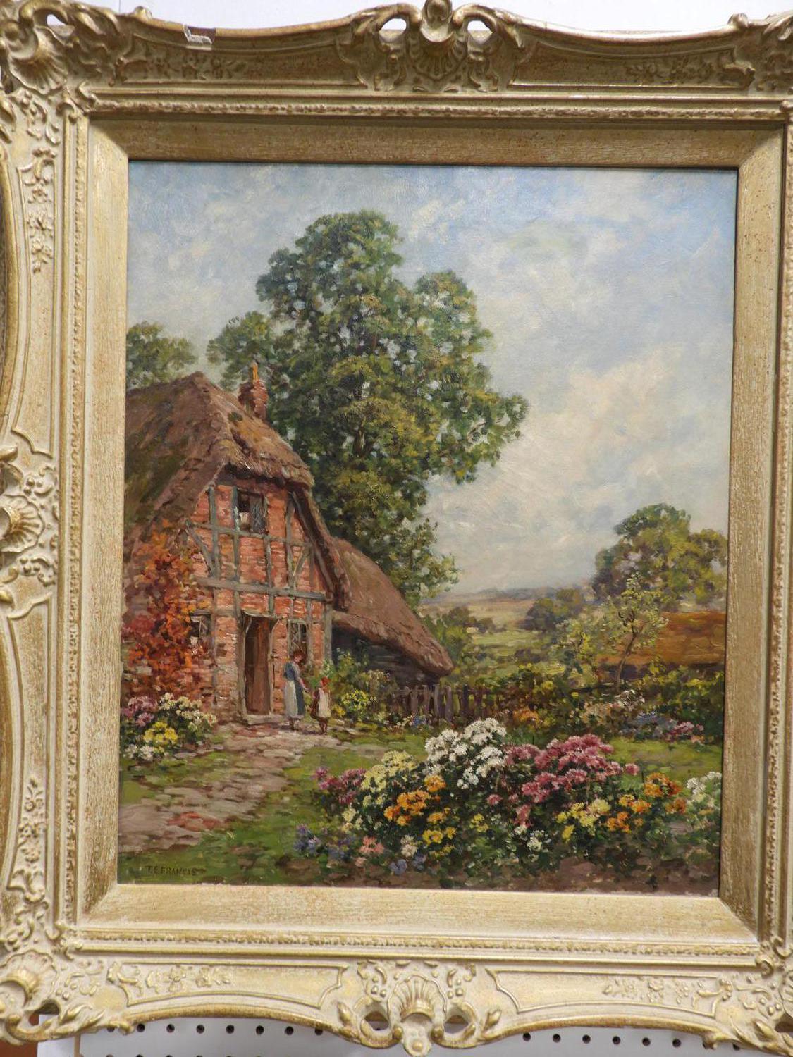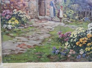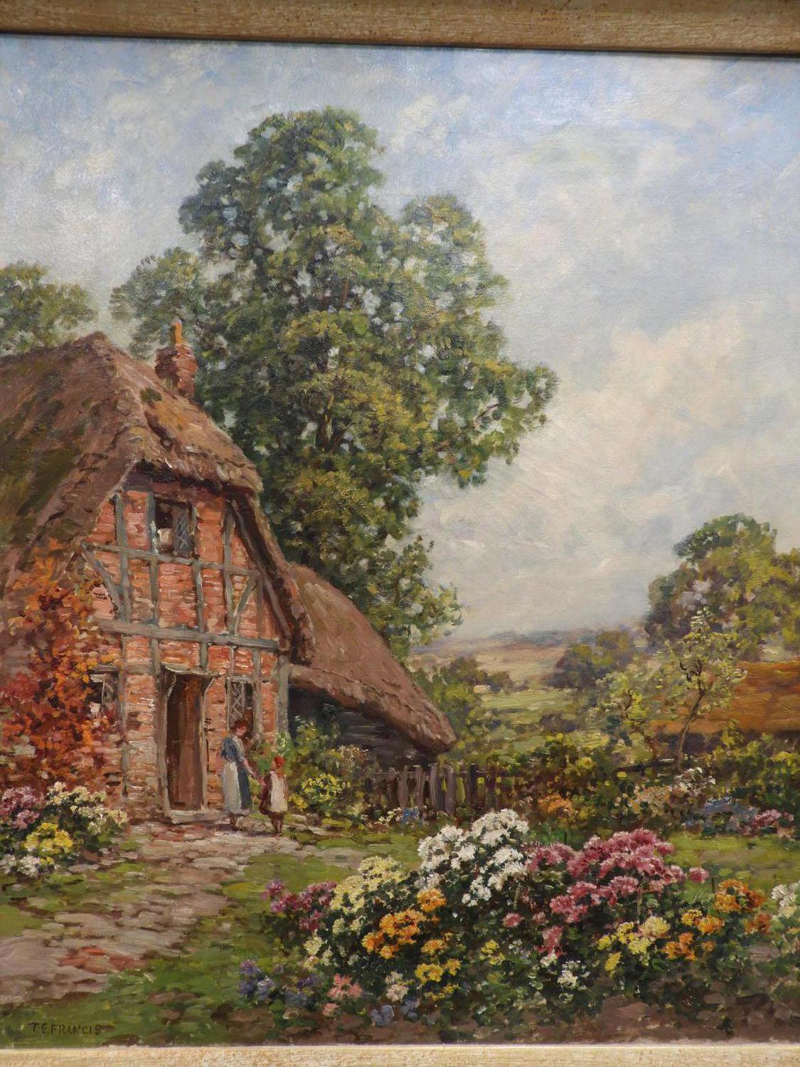 thomas edward francis, o/c, 24" x 20", "thatched cottage with figures in spring"