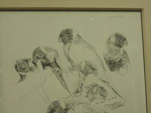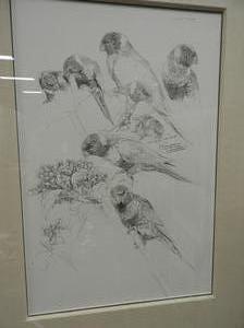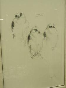 two raymon ching drawings, 21" x 14", hawks and parrots