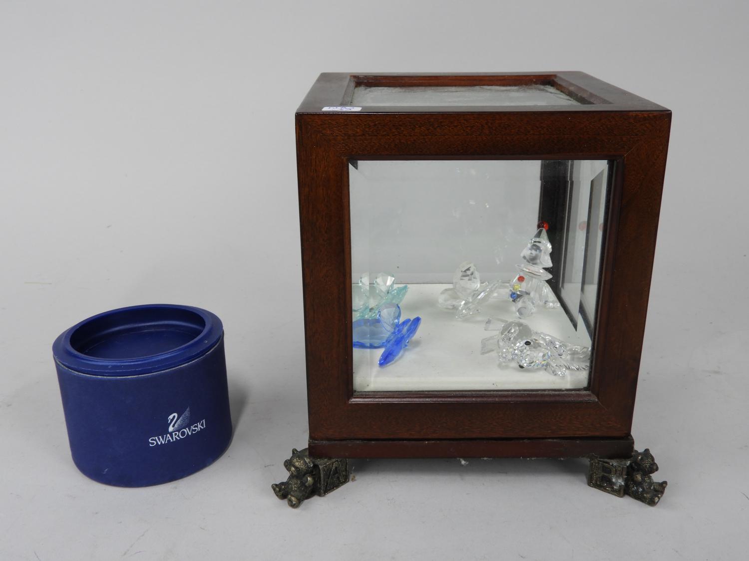 swarovski clown figurine, squirrel and butterflies in a footed showcase