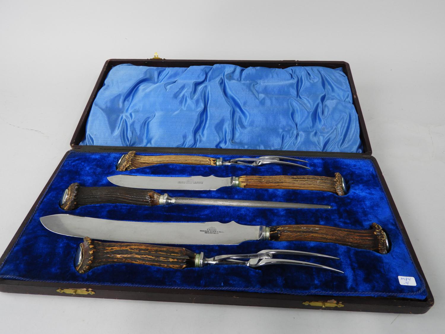 cased four piece stag handled carving set by thomas turner & co. suffolk, sheffield