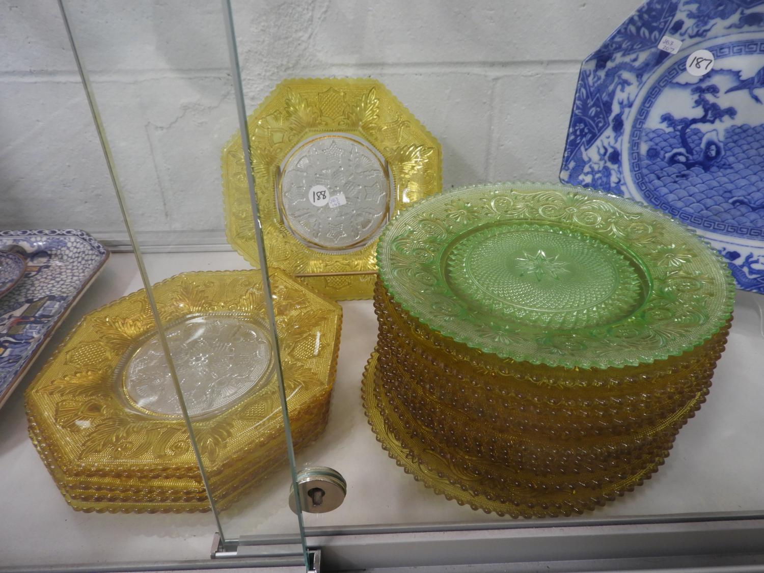 lot of coloured pressed glass plates etc.