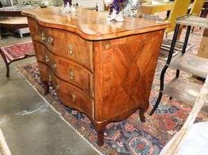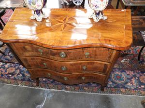18th century continental inlaid fruitwood serpentine front chest of drawers.
