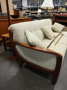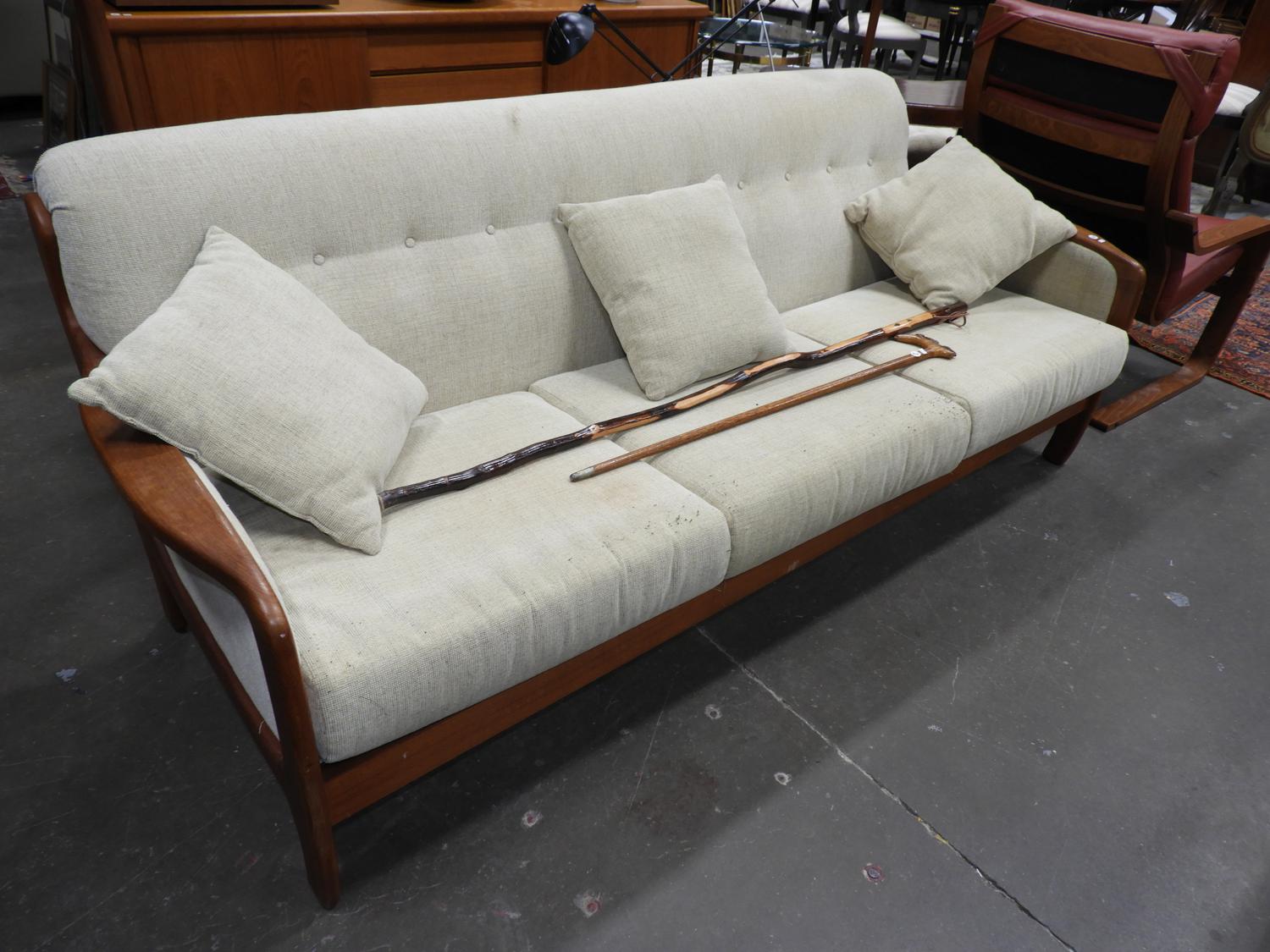 teak framed upholstered sofa.