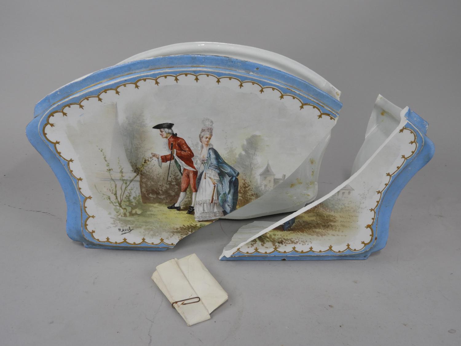 19th century handpainted planter signed raoul, in 3 pieces, damage noted