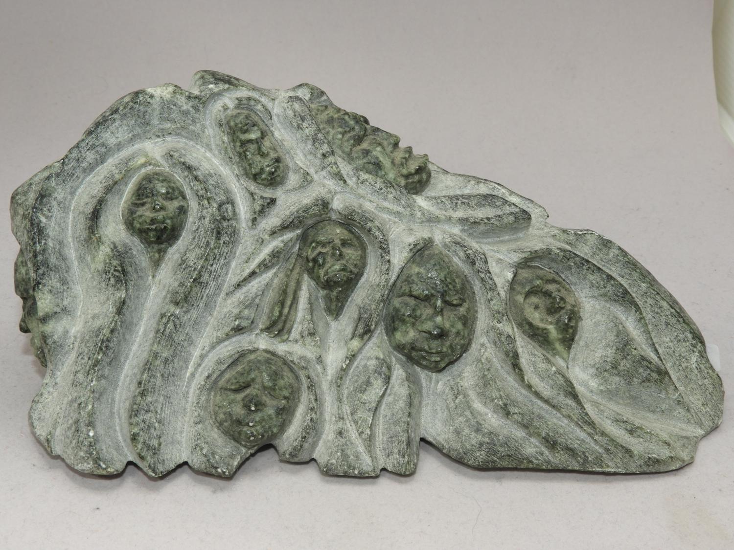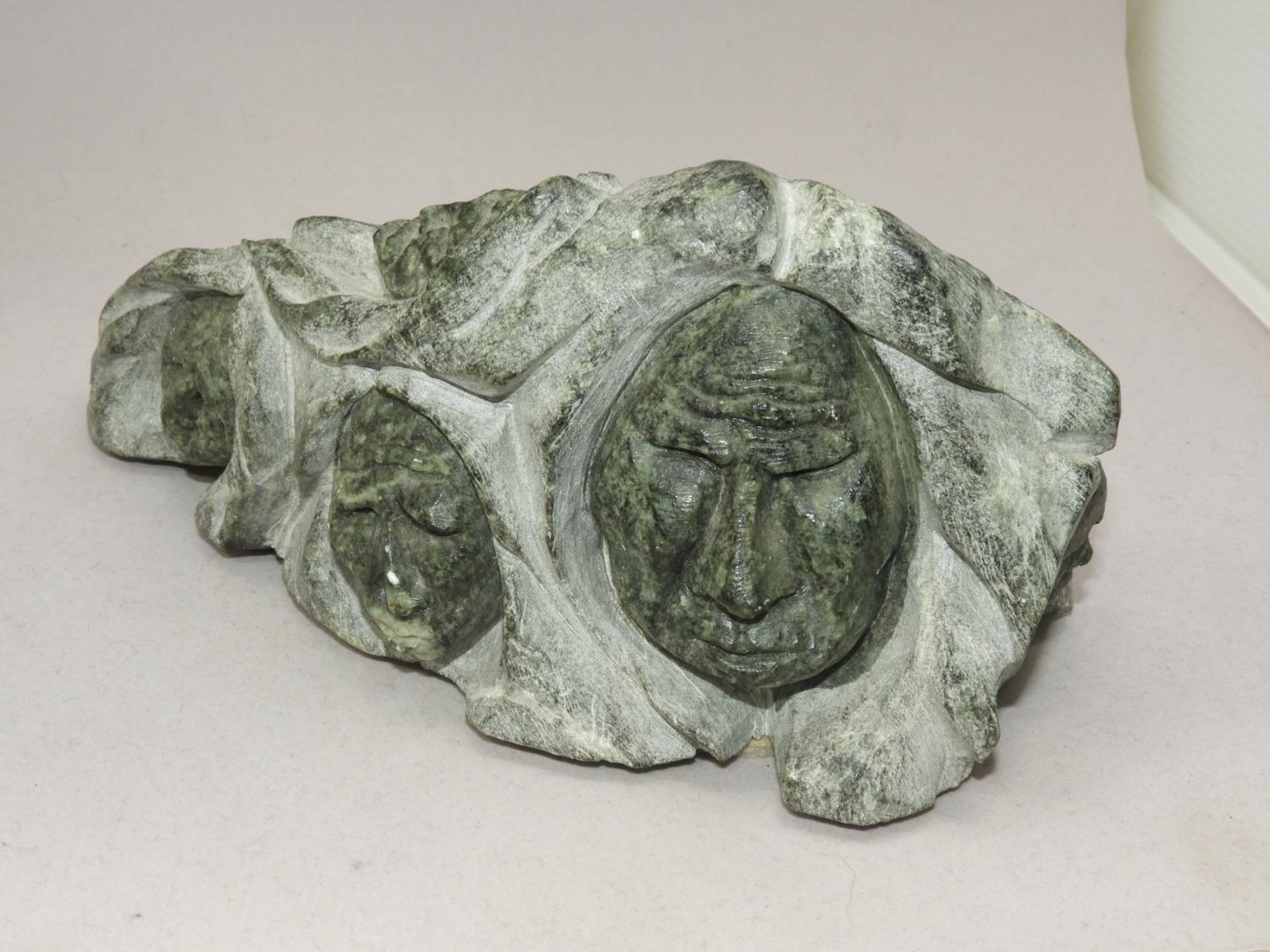 t. maracle carved stone sculpture, "faces", length 9"