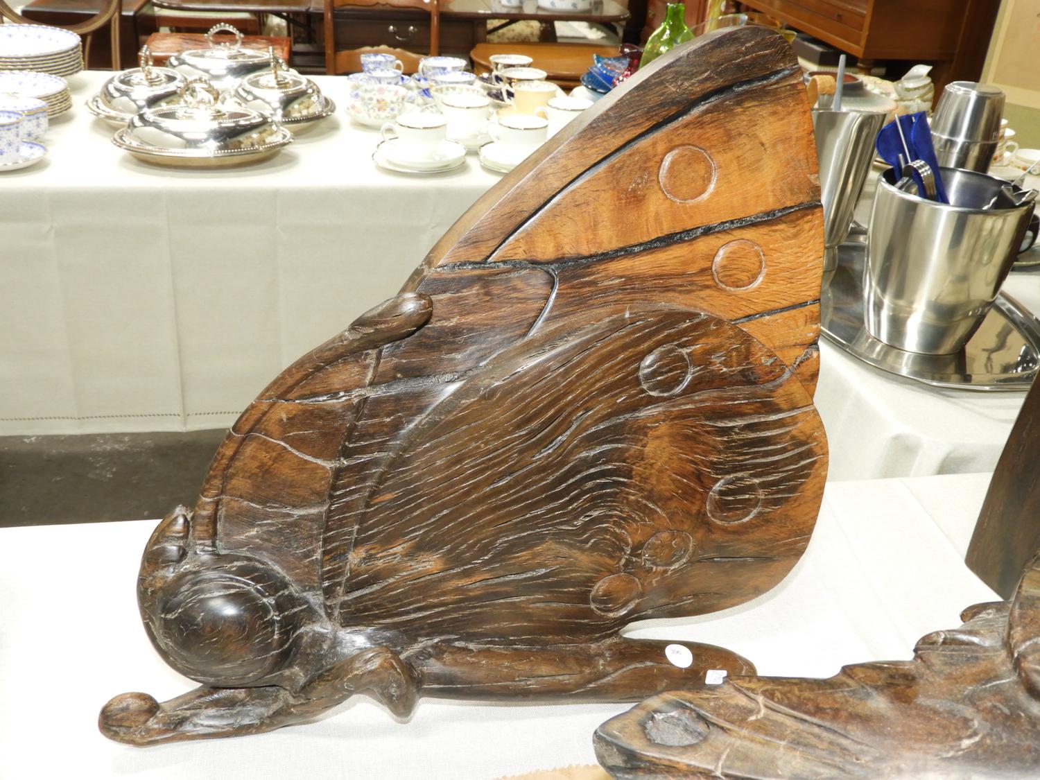 vie tulloch, carved hardwood sculpture of a moth, 18" x 17".