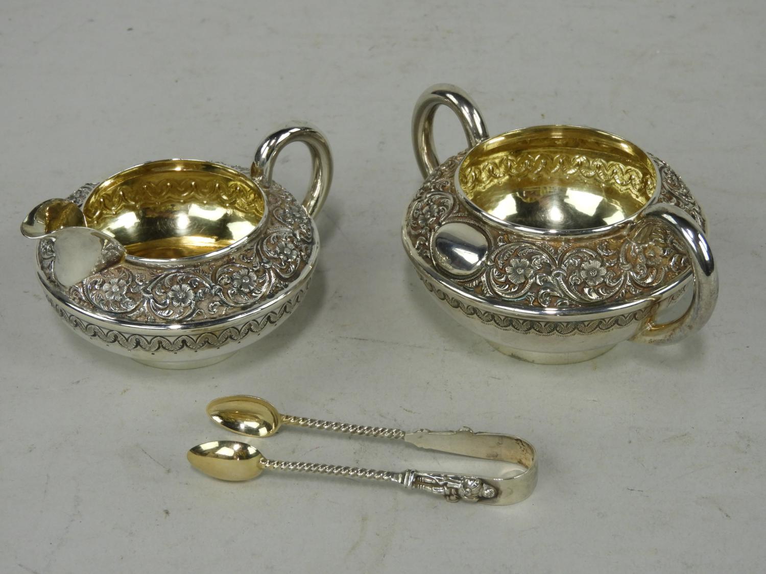 victorian hallmarked sterling silver cream and sugar, tongs