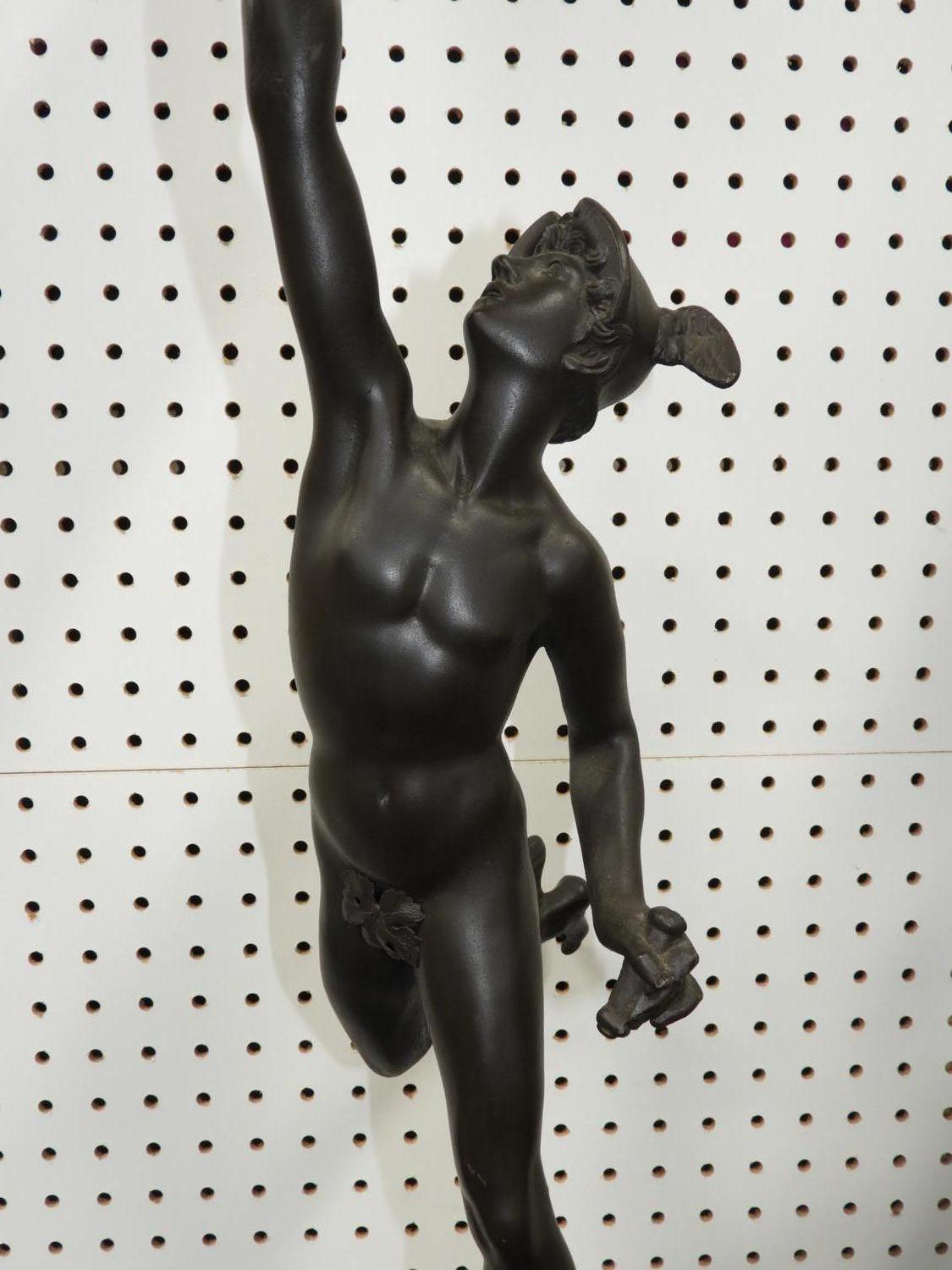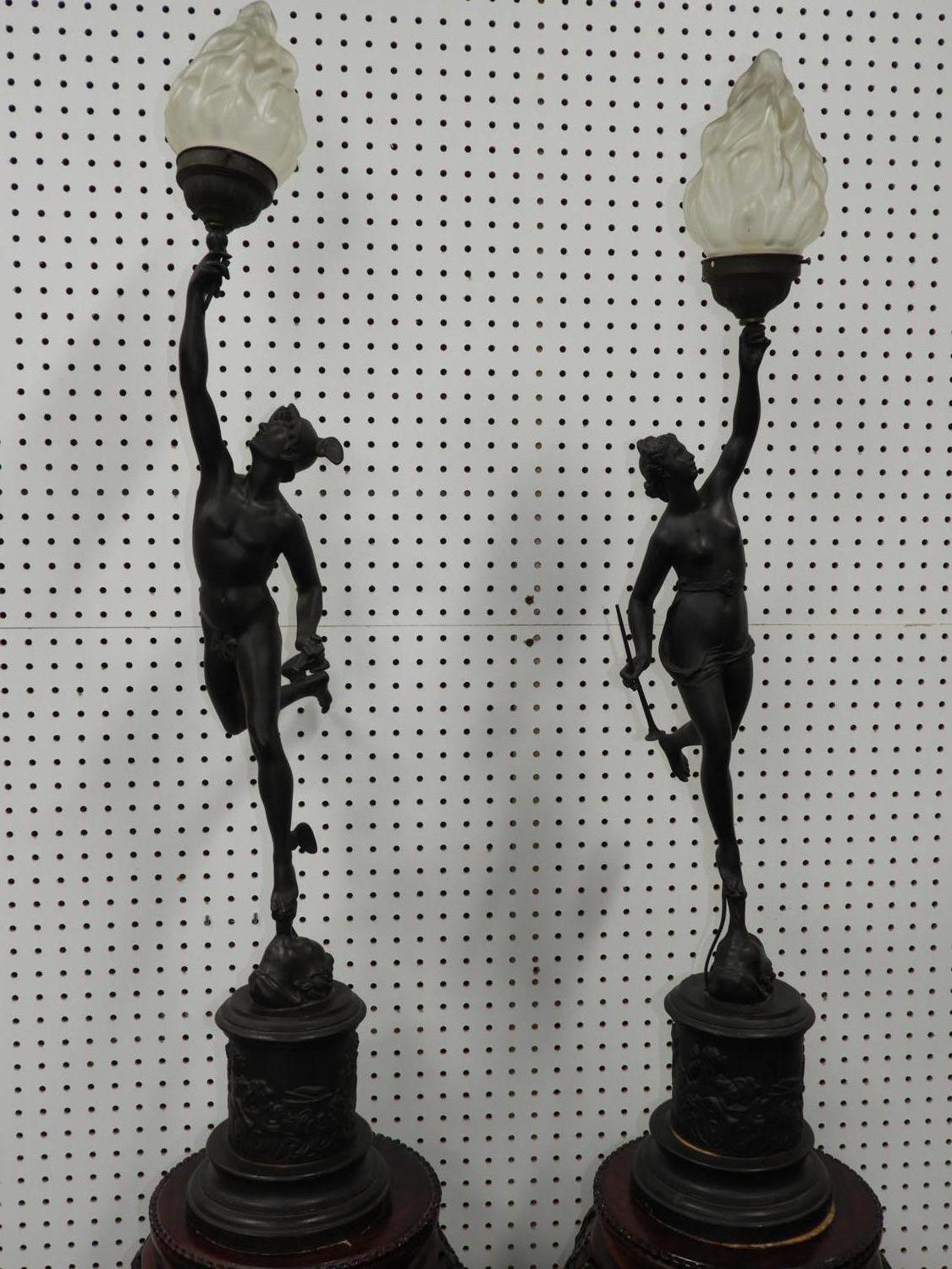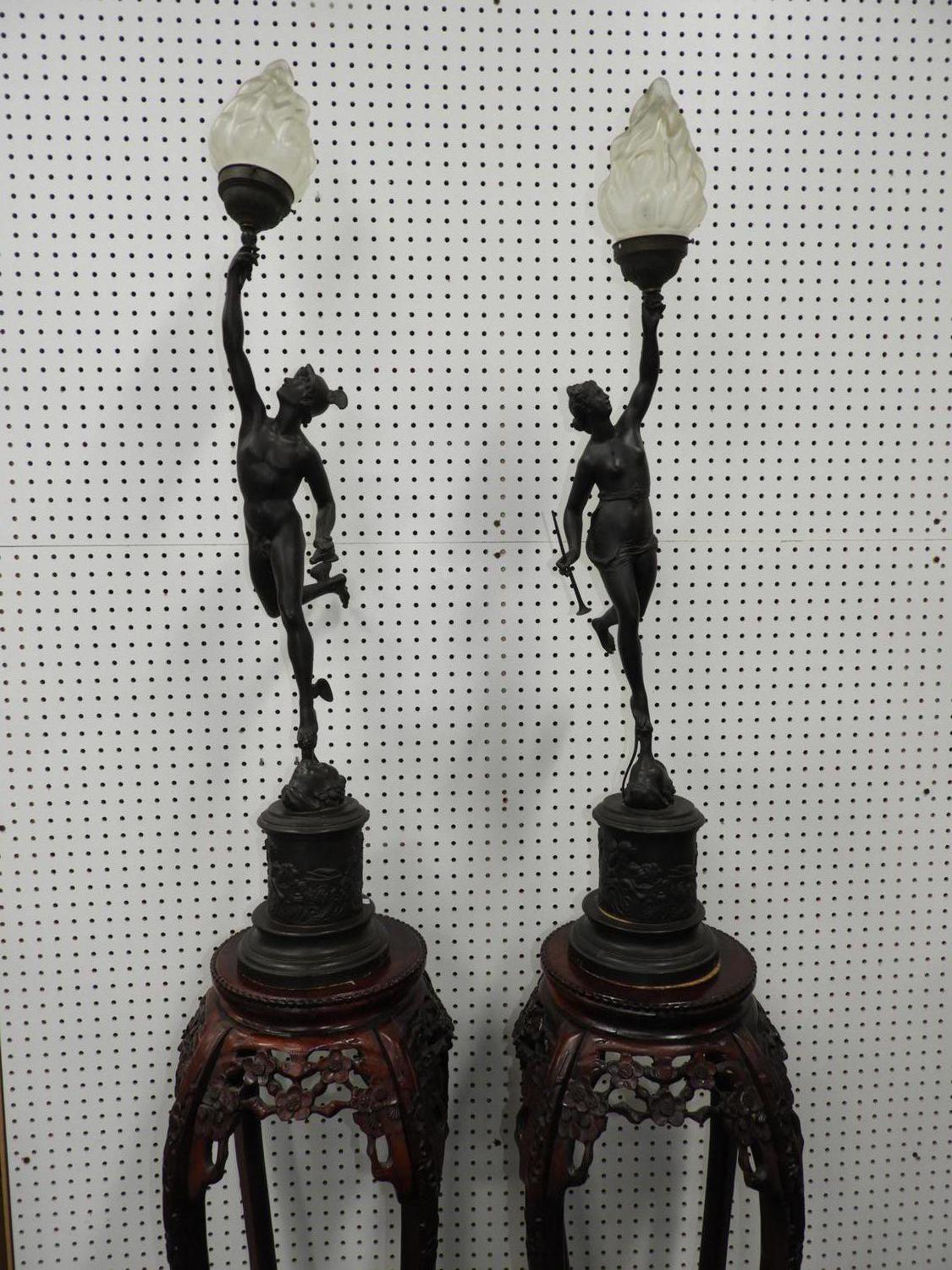 pair of bronze patinated figural newel post lamps, ht. 40"