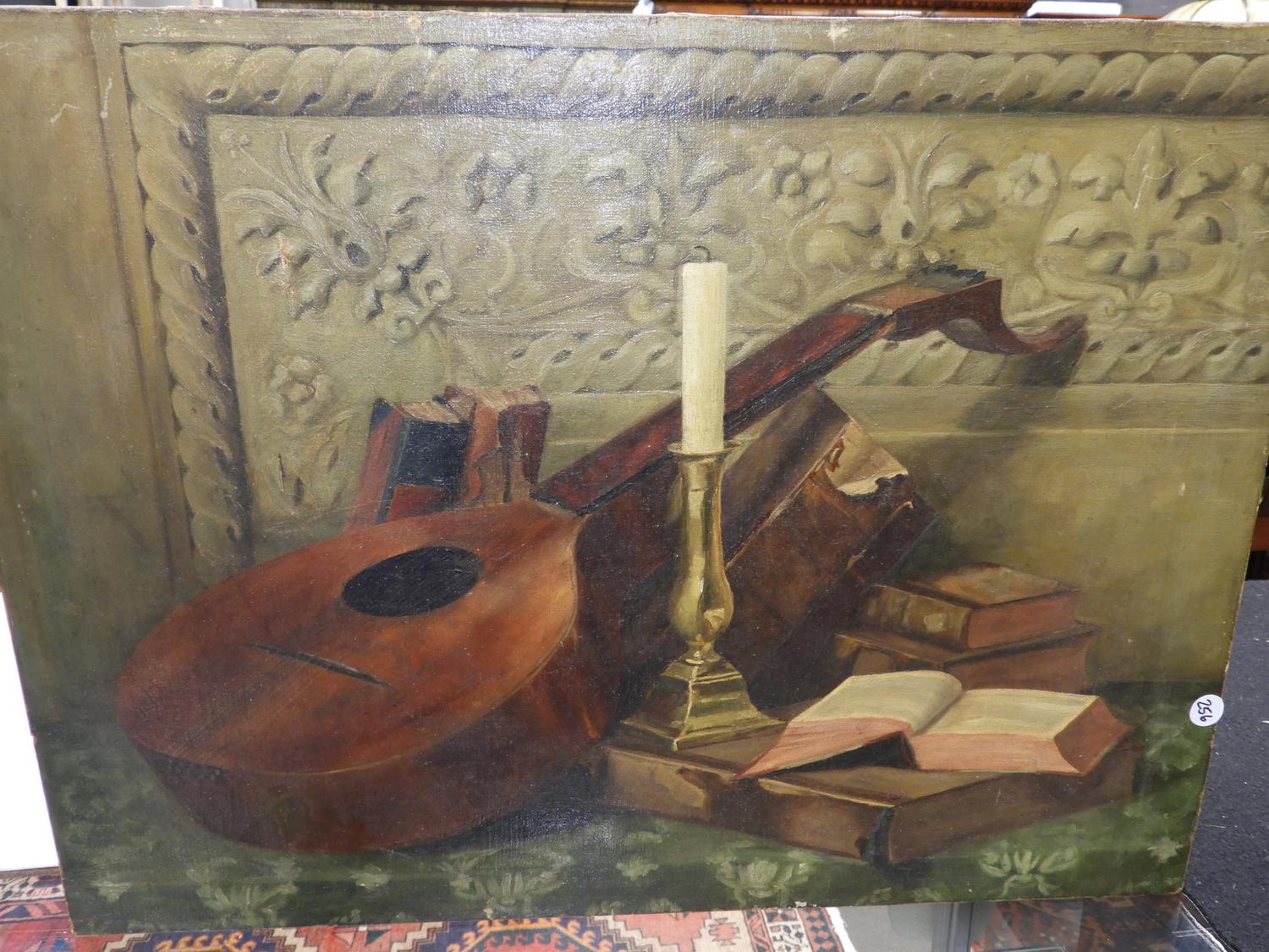 margaret w. edwards, oil on canvas, 18" x 24", "mandolin, candle and book".