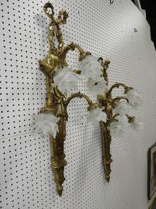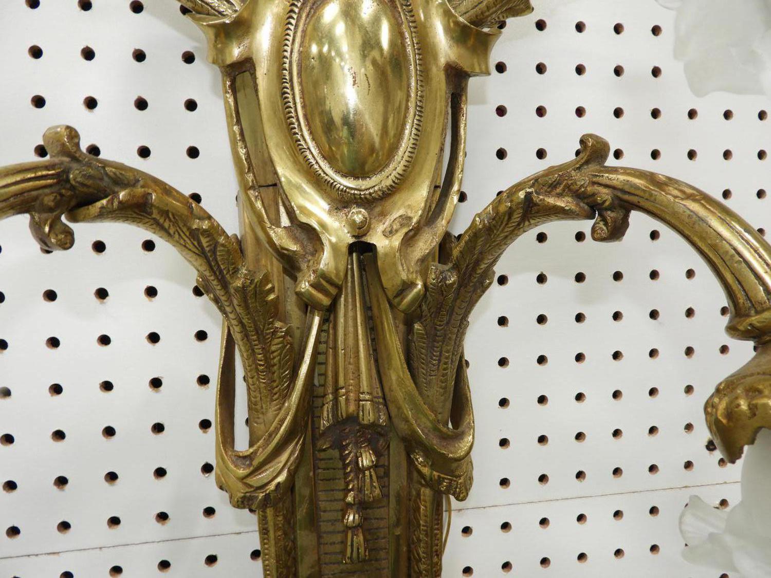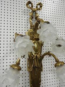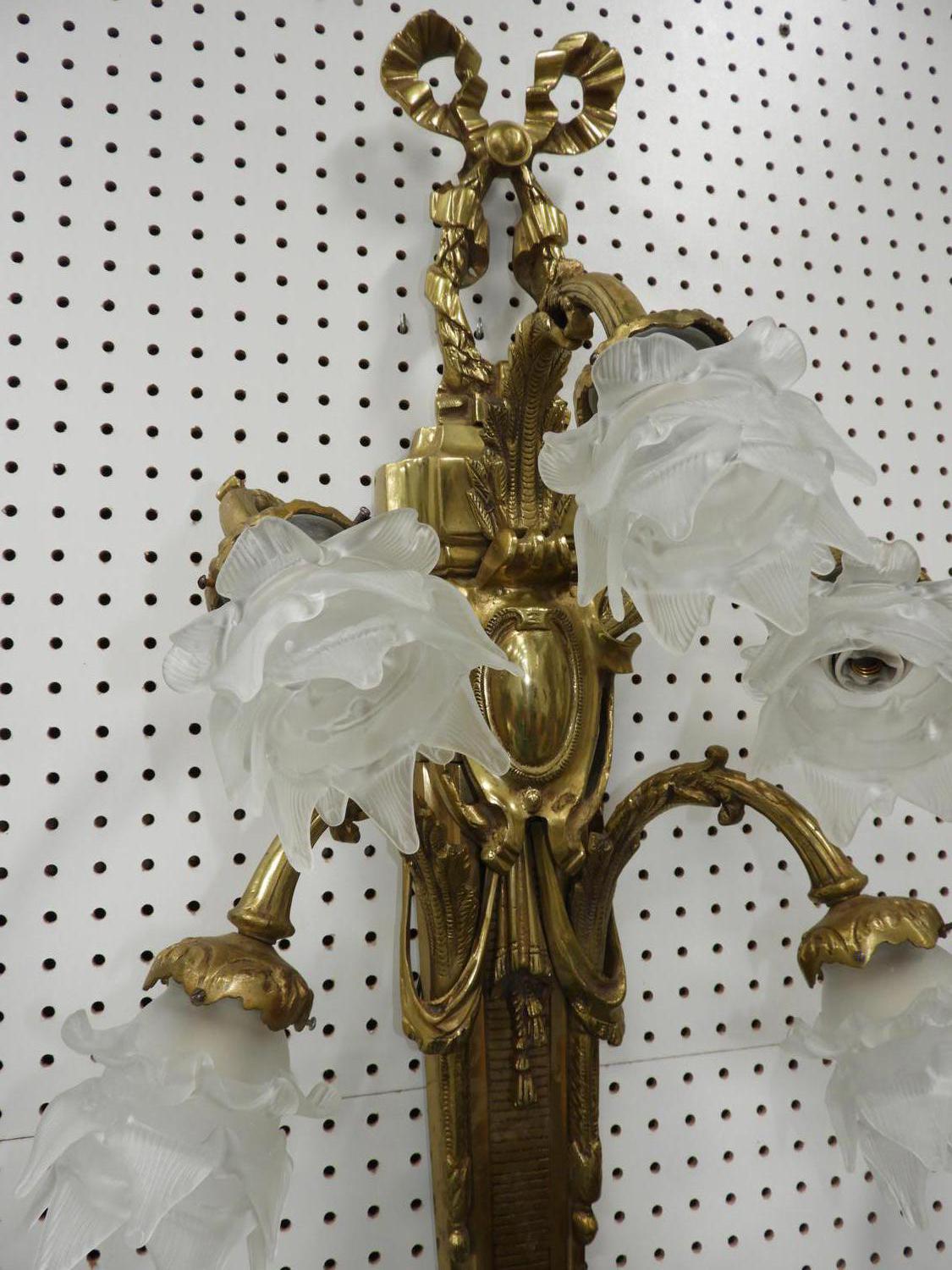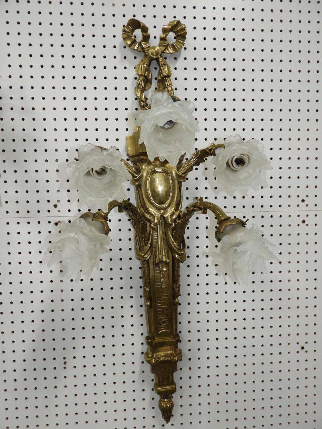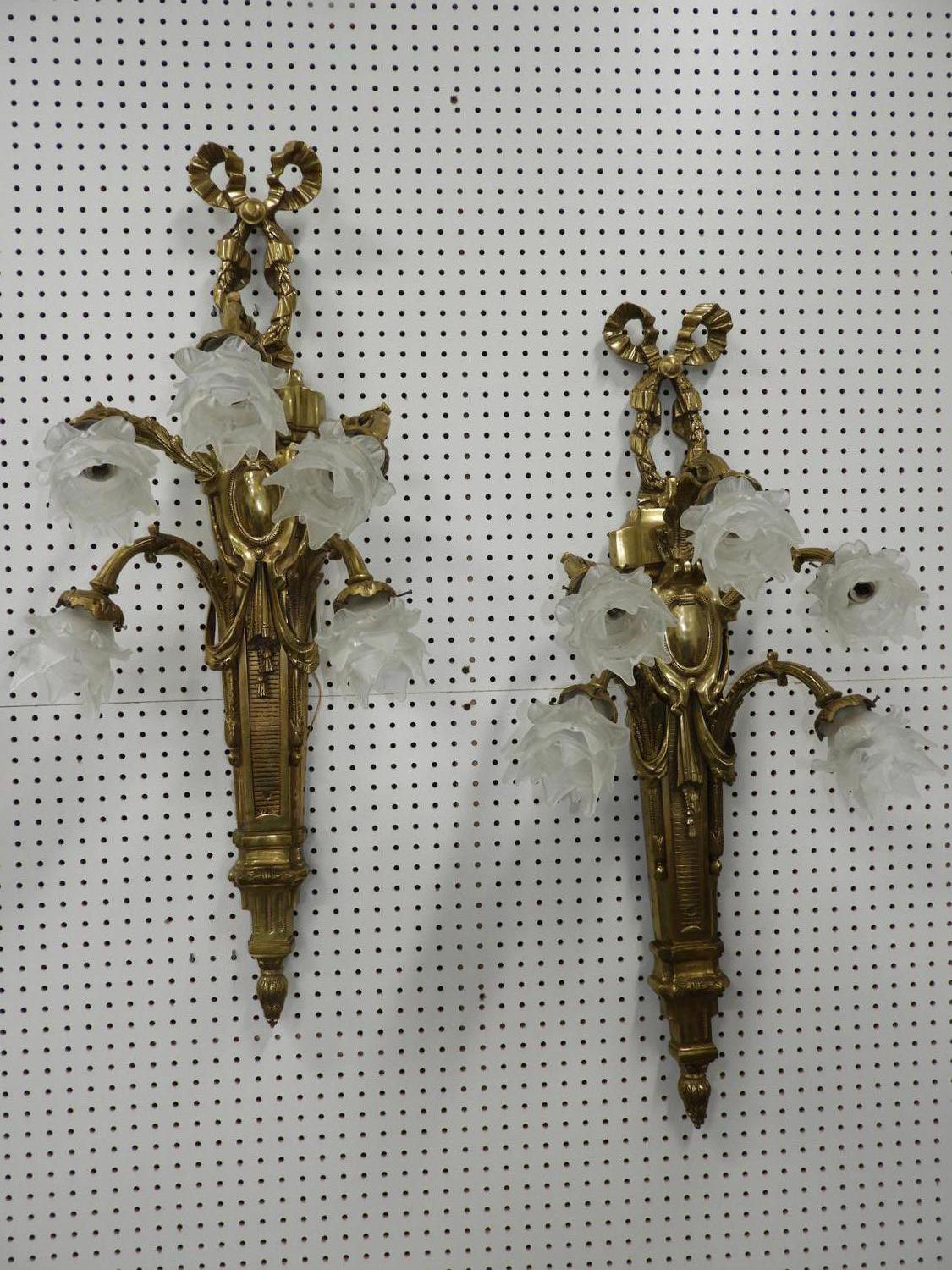 pair of gilt bronze 5-branch wall sconces with glass shades.