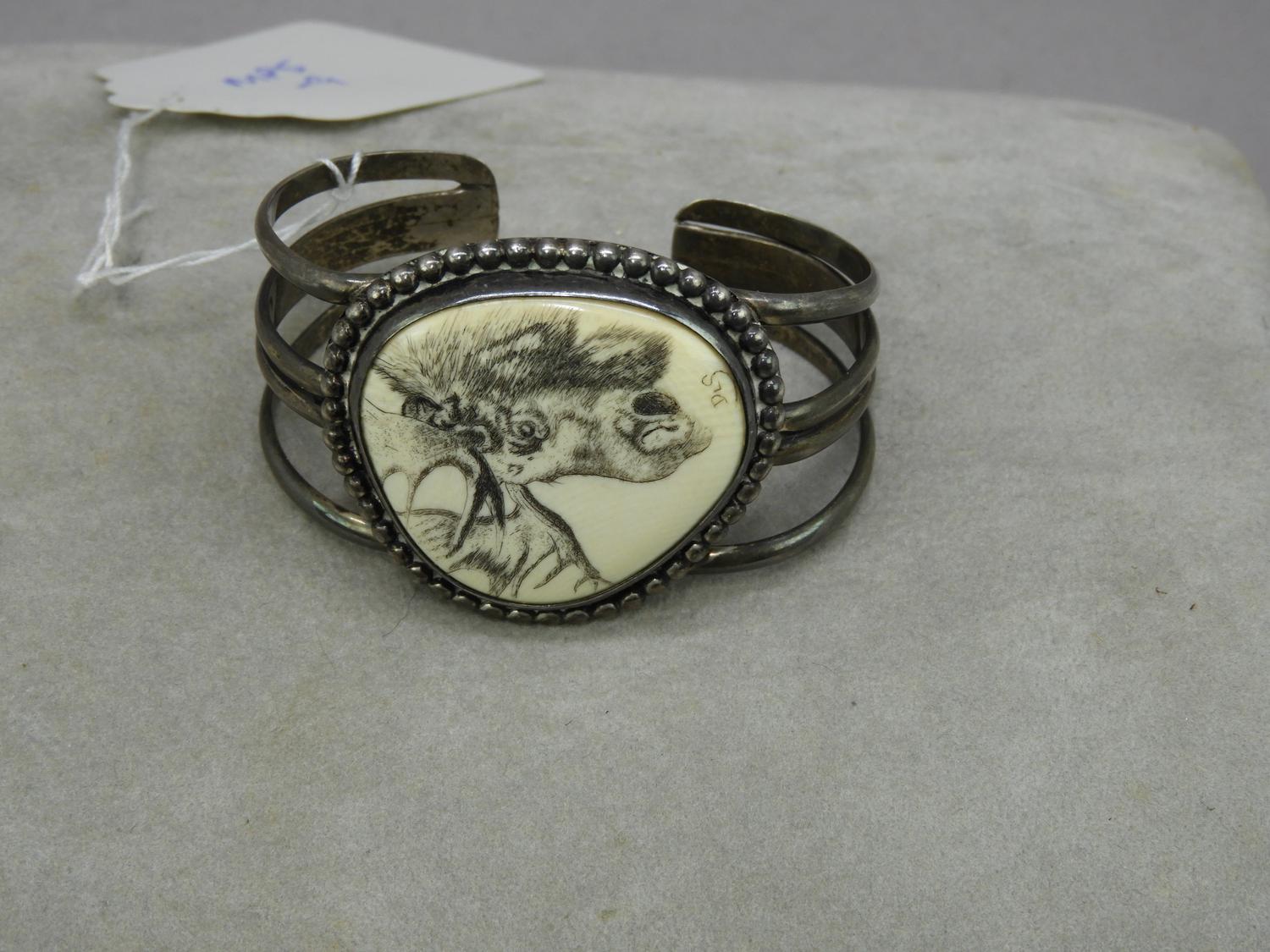 vintage sterling silver cuff with carved bone moose