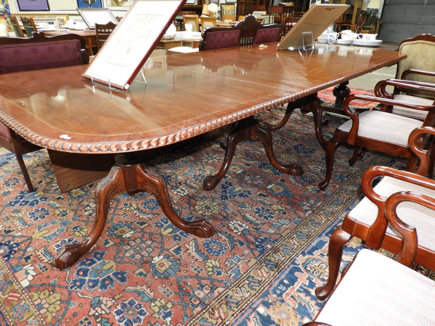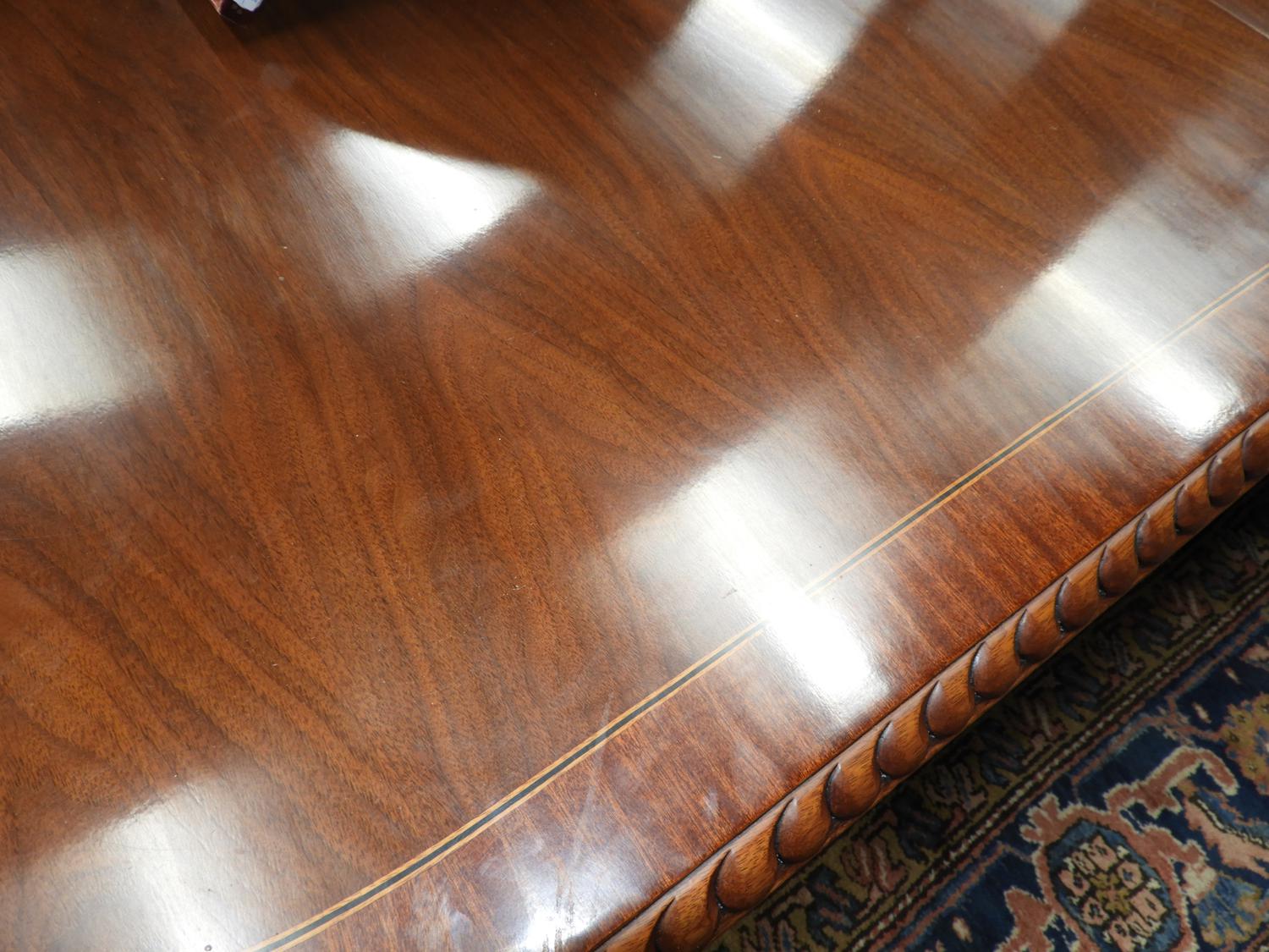 cross banded mahogany triple pedestal dinning table with two leaves.