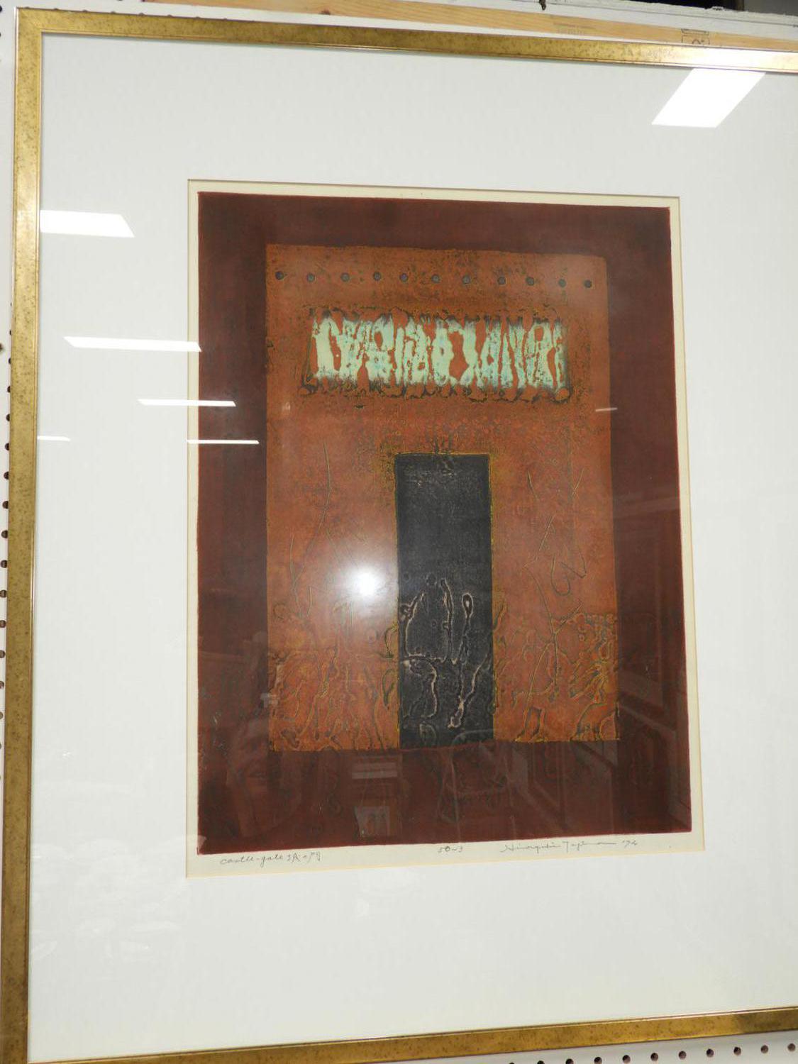 hiroyaki tajima, d.1973, woodcut in colours, 23" x 17", "castle-gate".