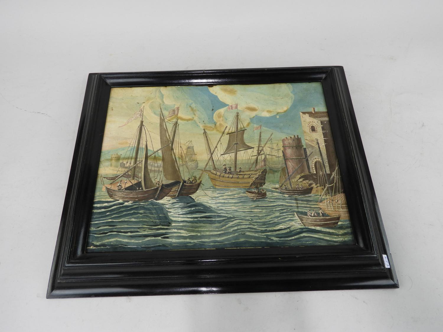 framed painted tile, 12" x 15 1/2", "maritime scene"