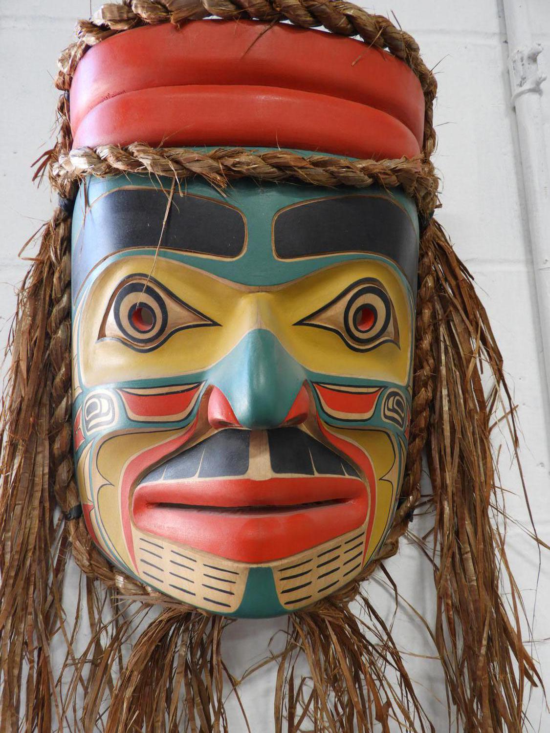 west coast carved and painted cedar mask by randy stiglitz, ht. 22".