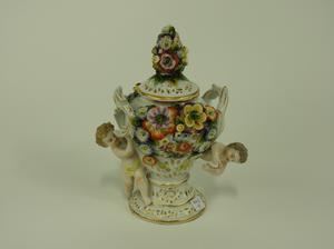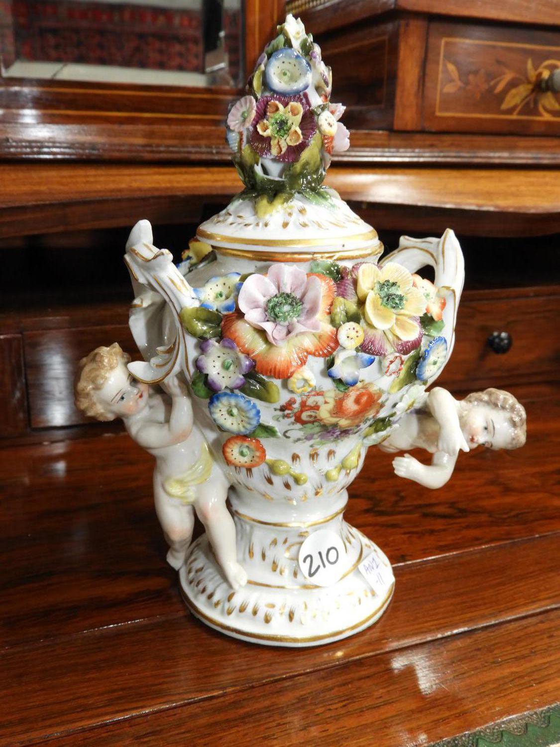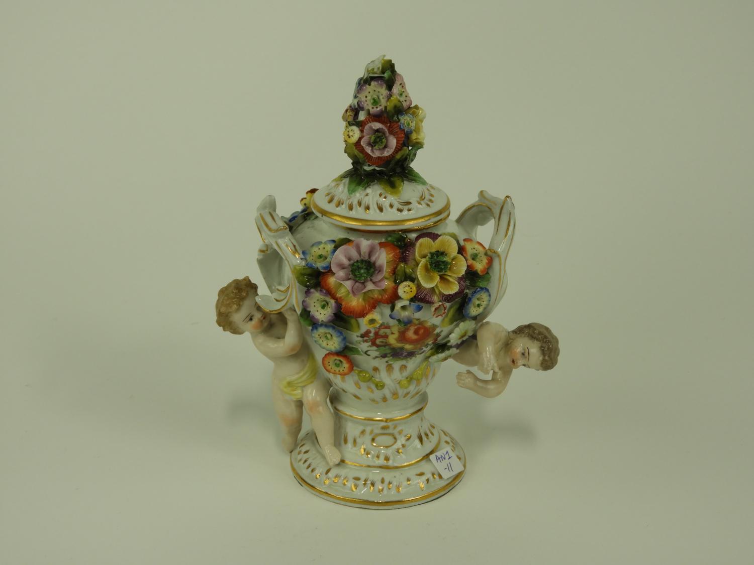 19th century floral encrusted putti decorated covered vase., h t 8"