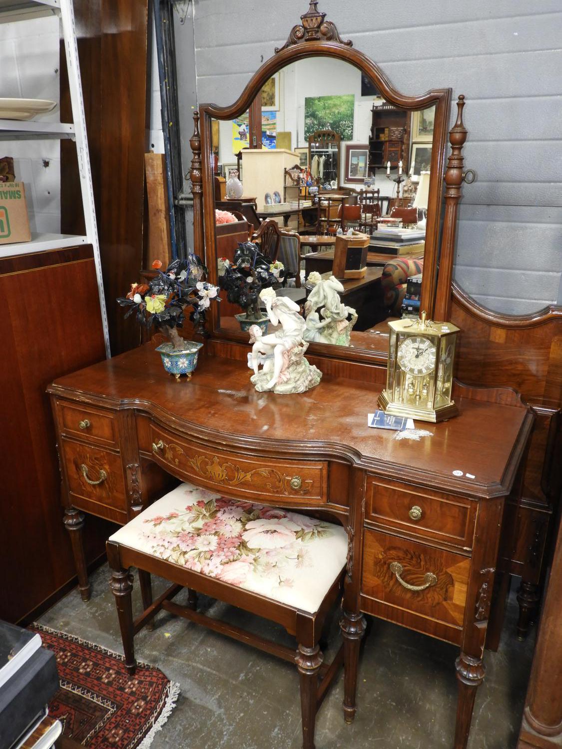 early 20th century walnut vanity dresser with bench and matching bed frame.