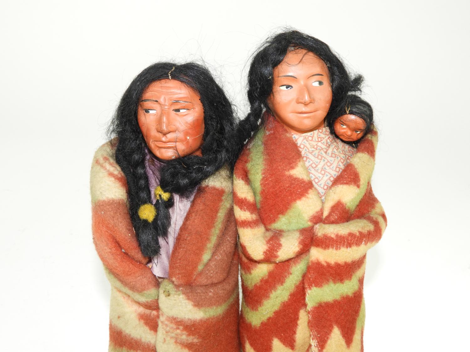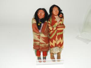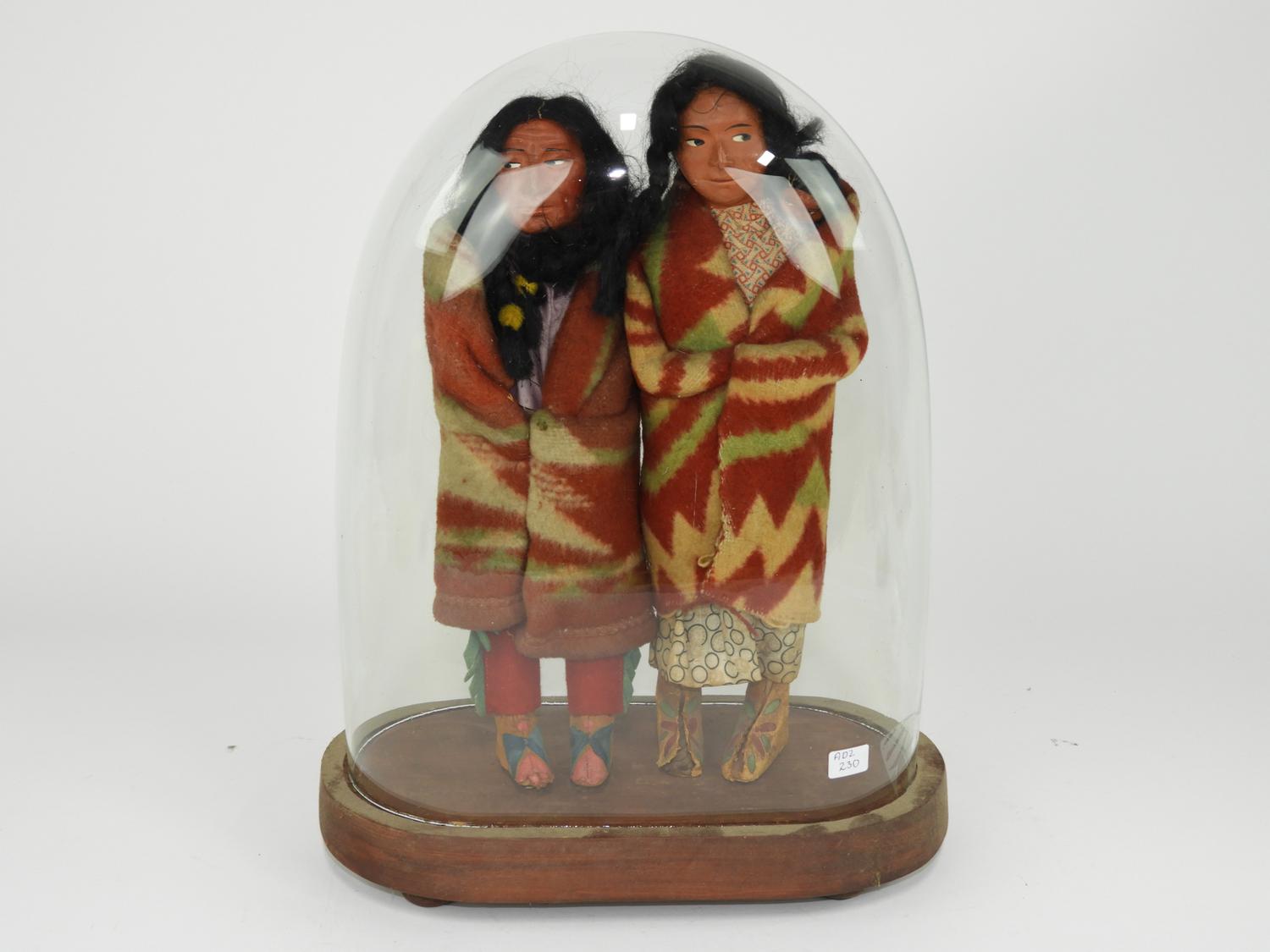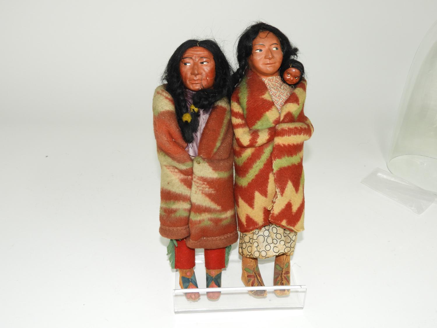 snookum (bully good) and wife wiht child indian dolls in specimen glass case
