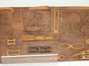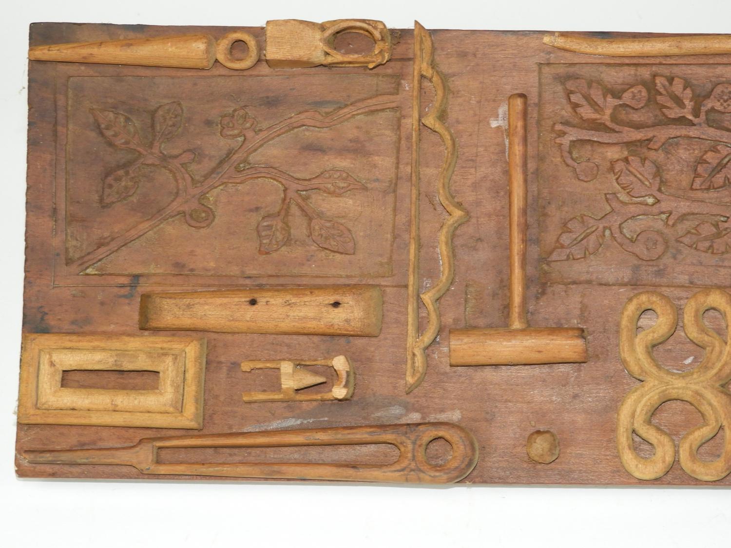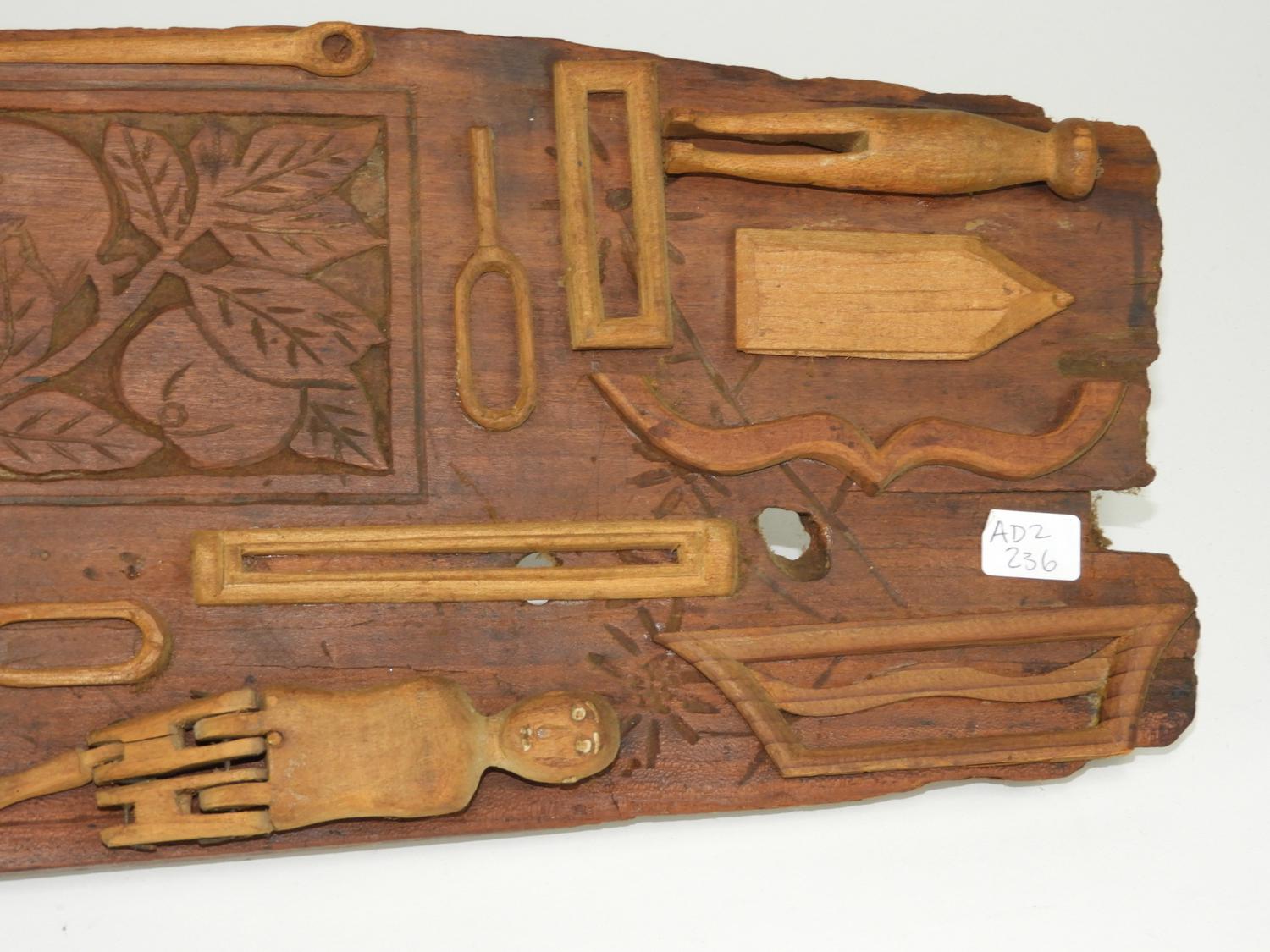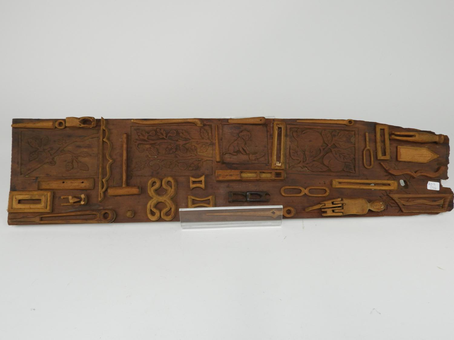 folk art carved panel with carpenter motif, 27" x 6 7/8"