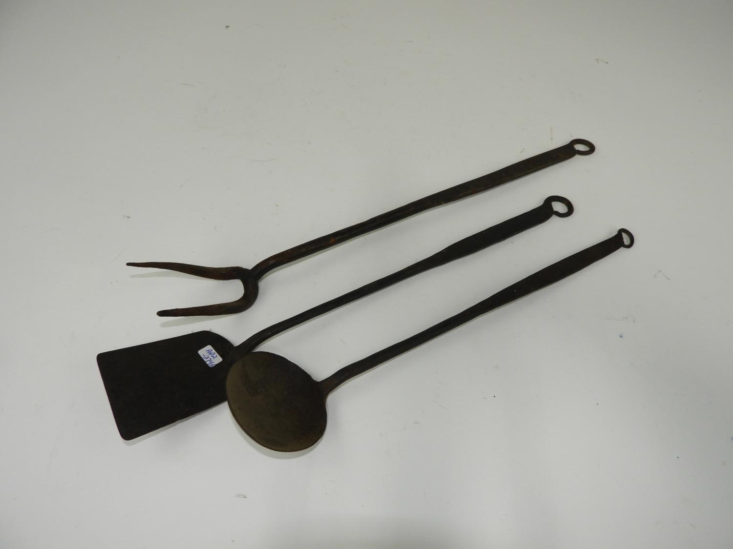 three primitive wrought iron utensils, one dated 1844, with partial initials